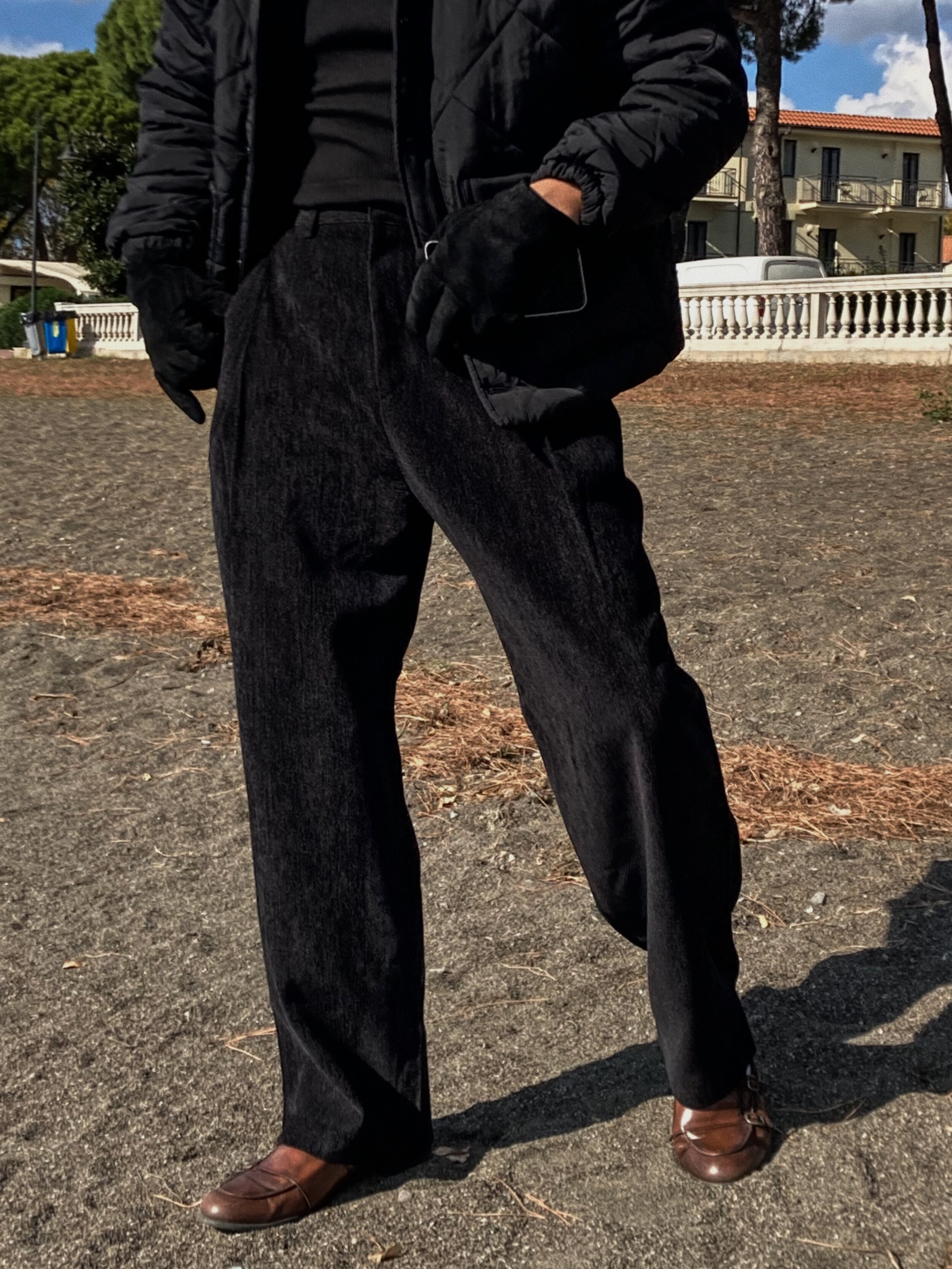 - 사선으로 처리된 잔잔한 골덴 원단감 포인트