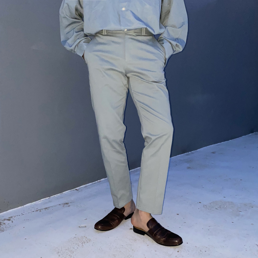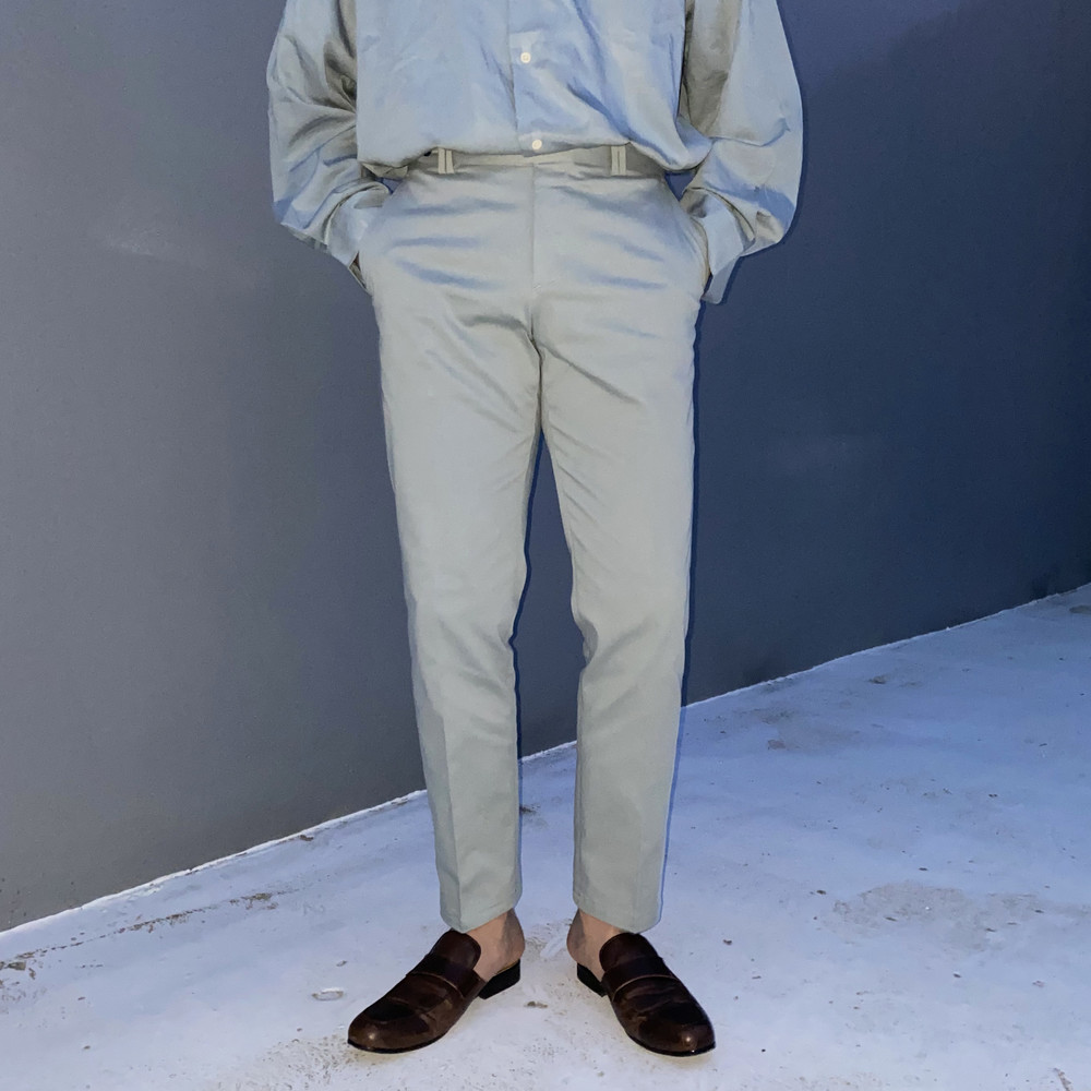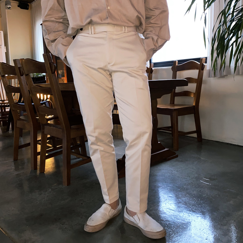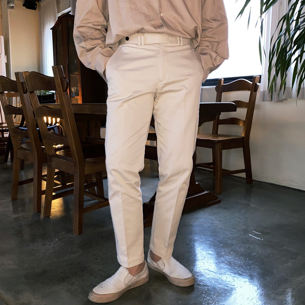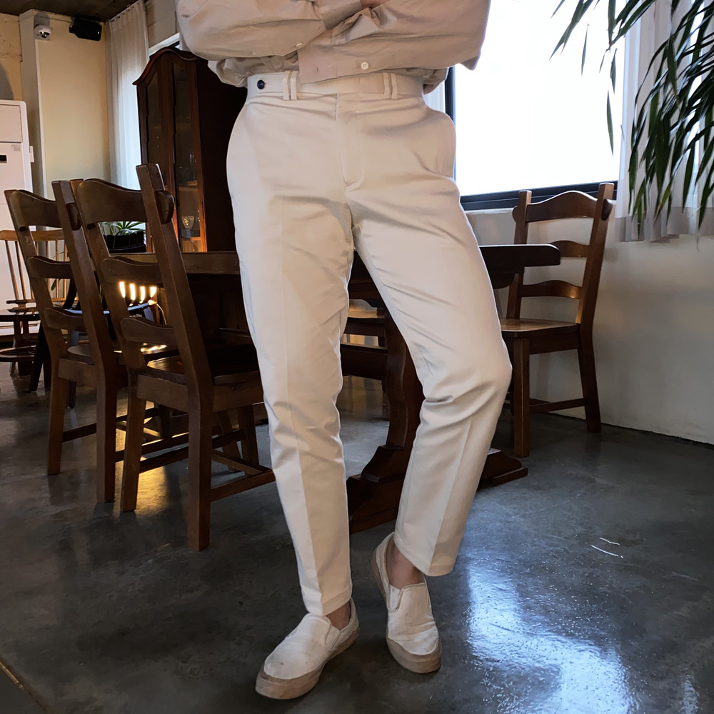 허리에 길게 로브 형식의 버튼 벨트가 달려있는 치노팬츠에요