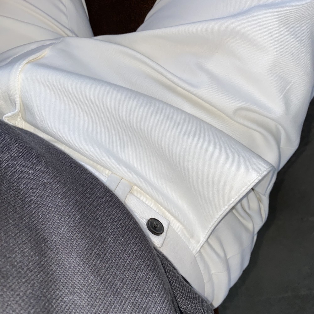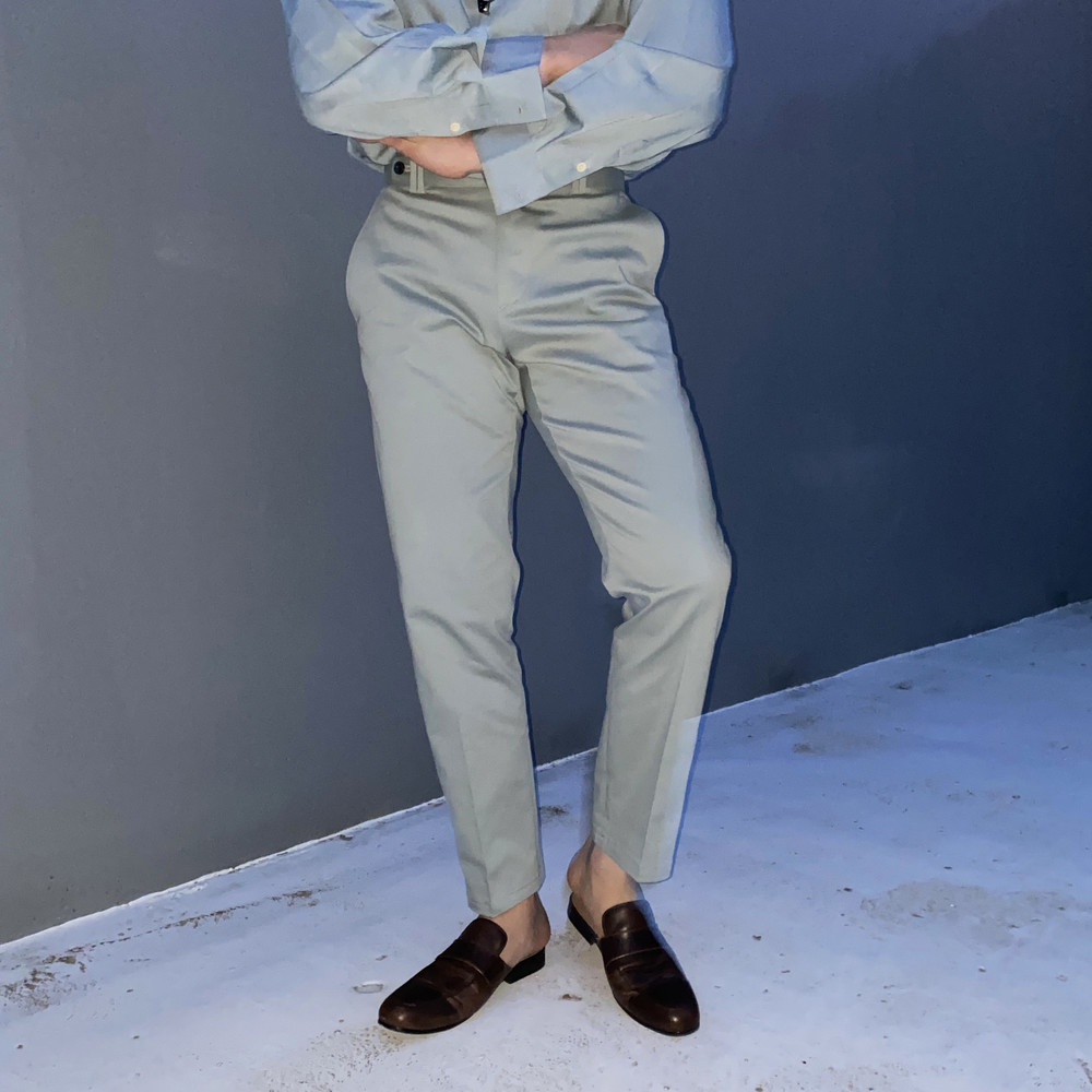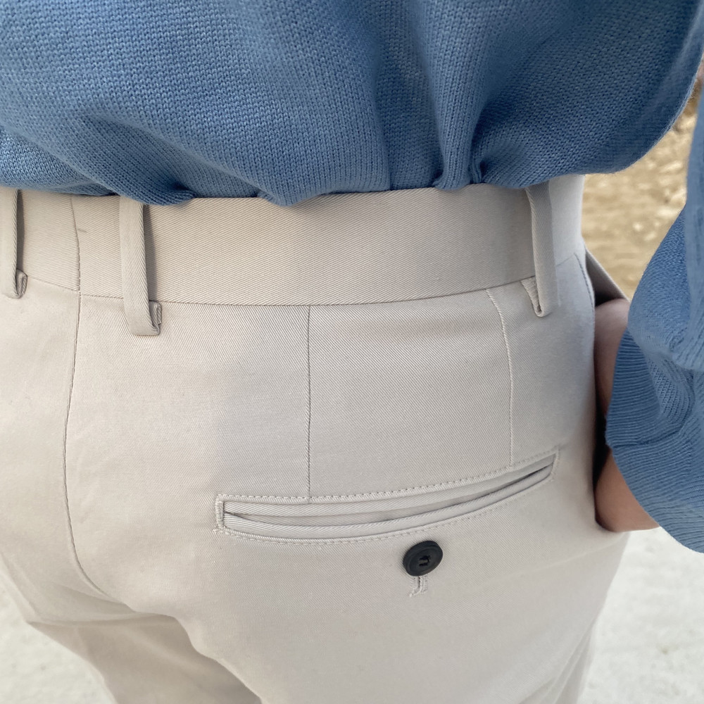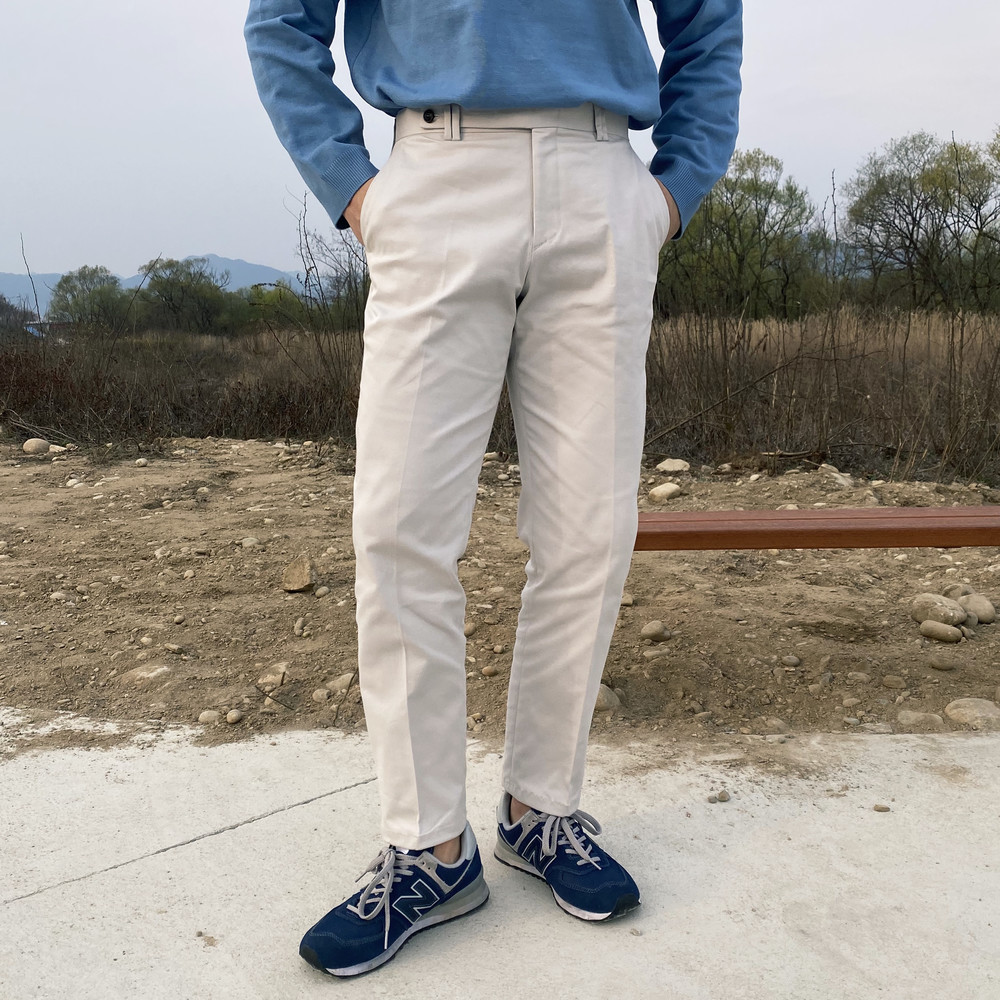 허리에 길게 로브 형식의 버튼 벨트가 달려있는 치노팬츠에요