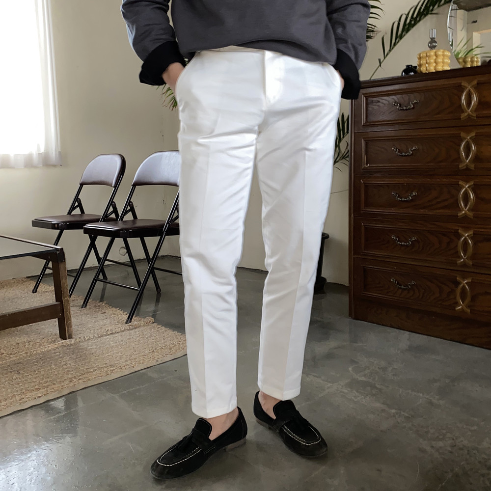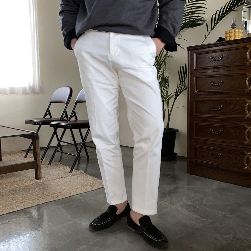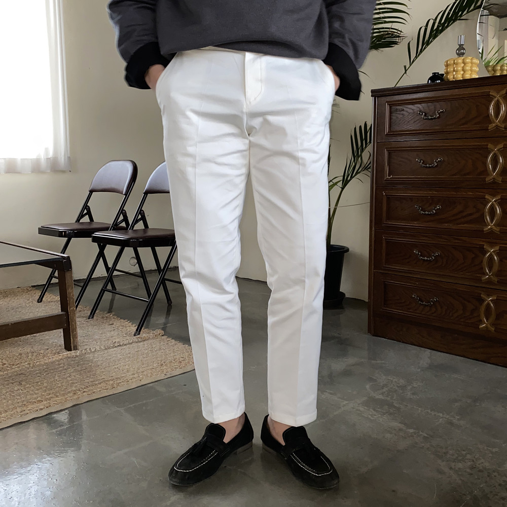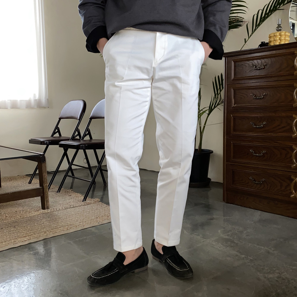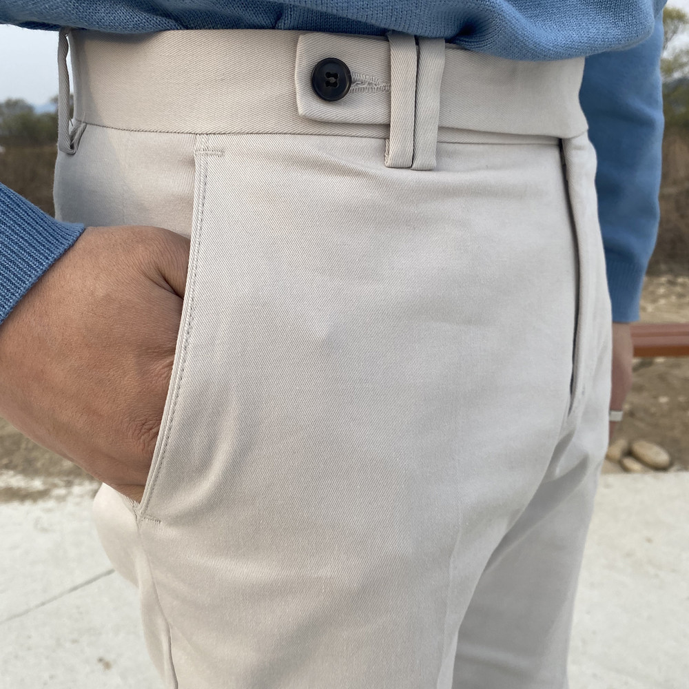 허리에 길게 로브 형식의 버튼 벨트가 달려있는 치노팬츠에요