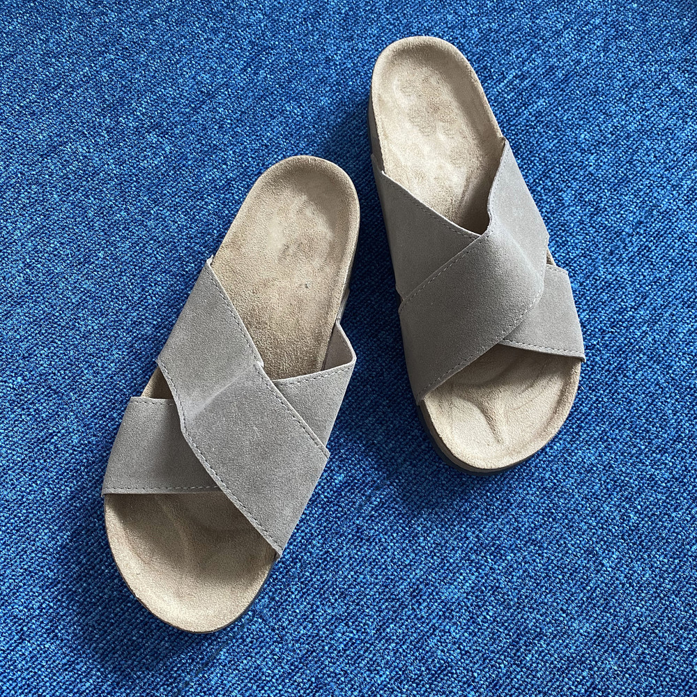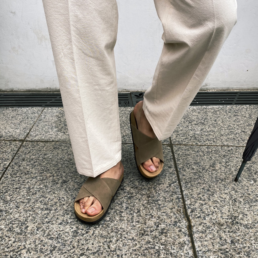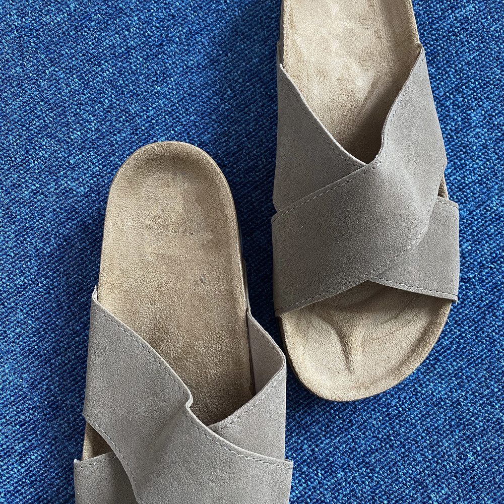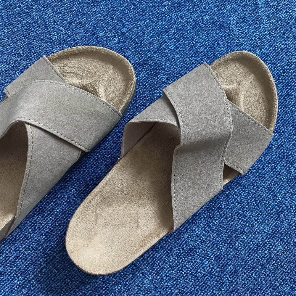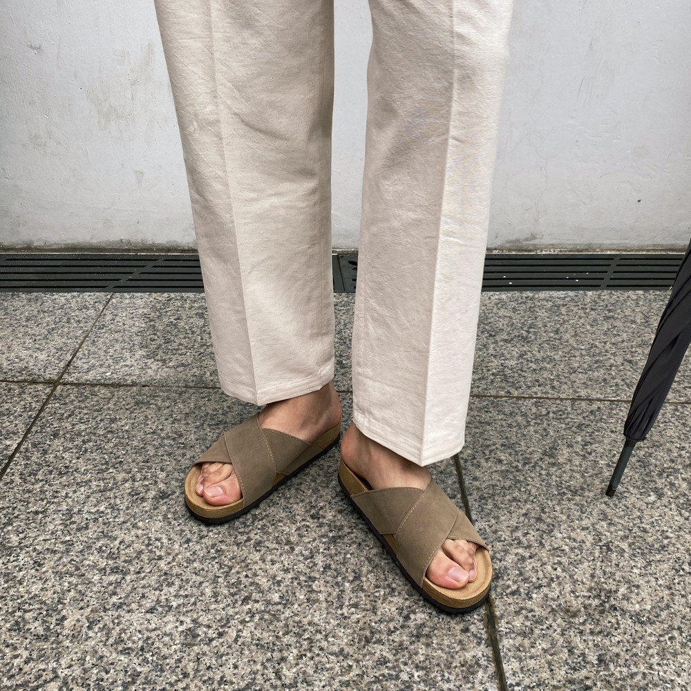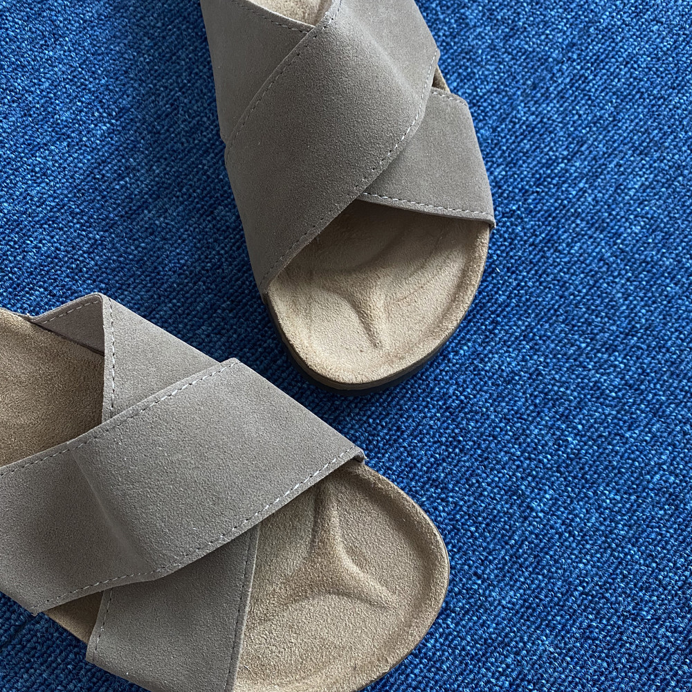 베이지컬러 스웨이드 원단의 심플한 x자 슬리퍼입니다