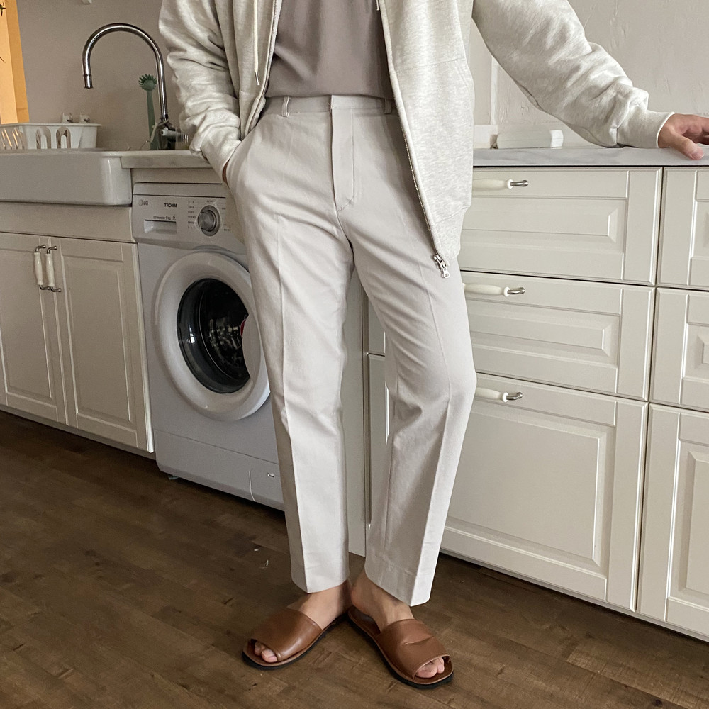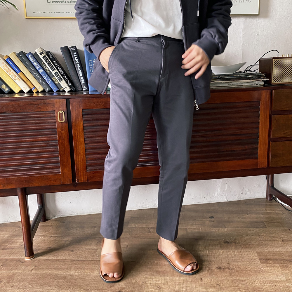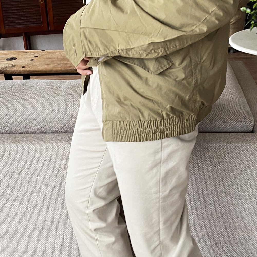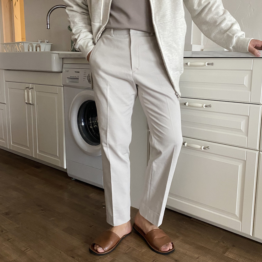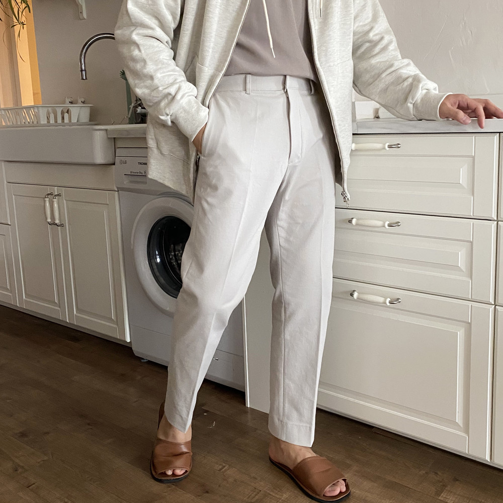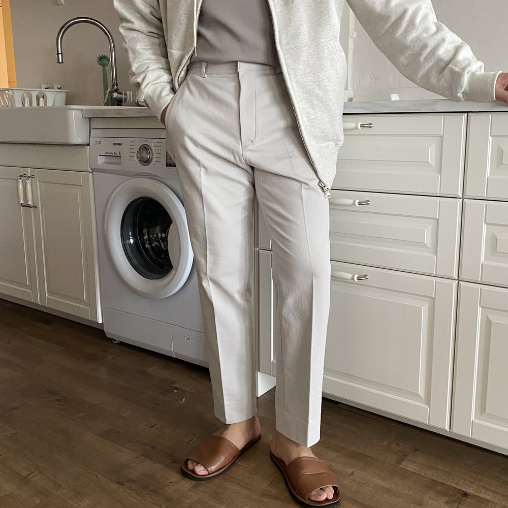 면 원단의 허리 뒷부분 밴딩 처리되어있는 슬랙스 느낌의 면팬츠에요