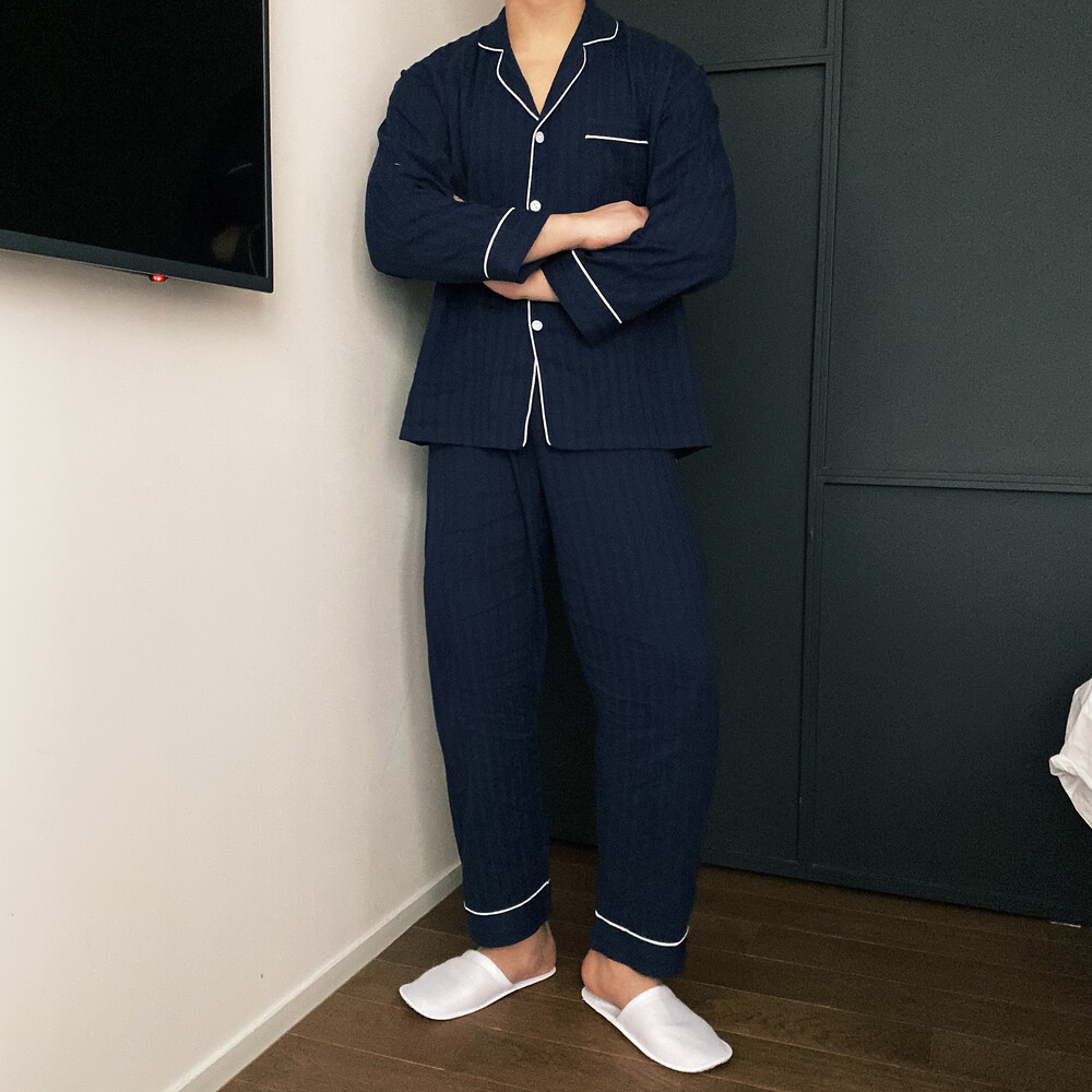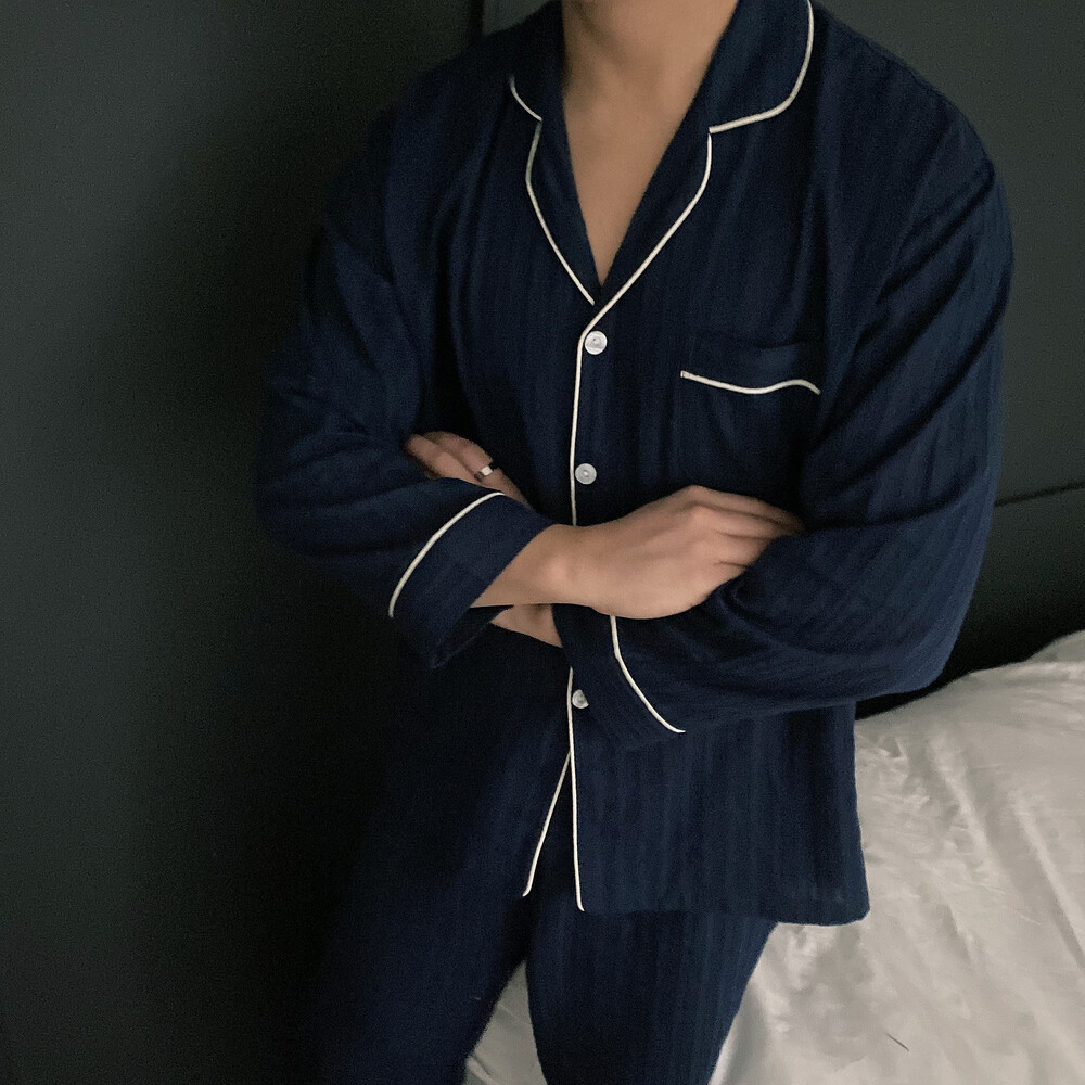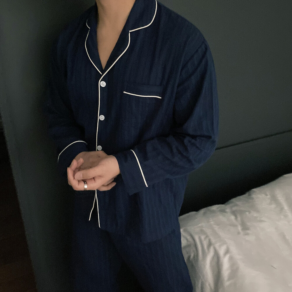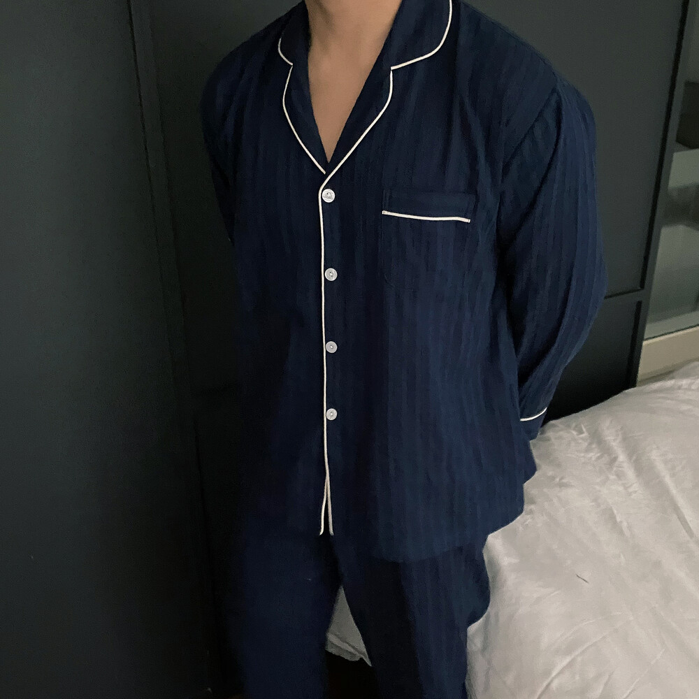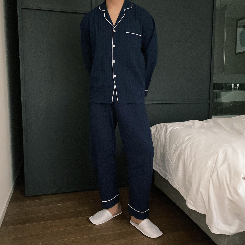 네이비 컬러의 세로줄 패턴으로 편안함은 물론 섹시함까지 챙겨가는 파자마 셋업입니다