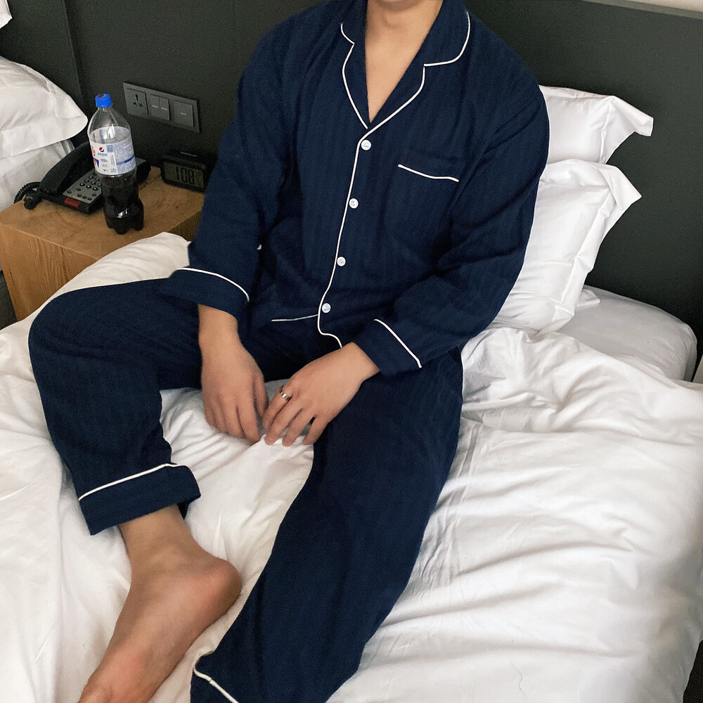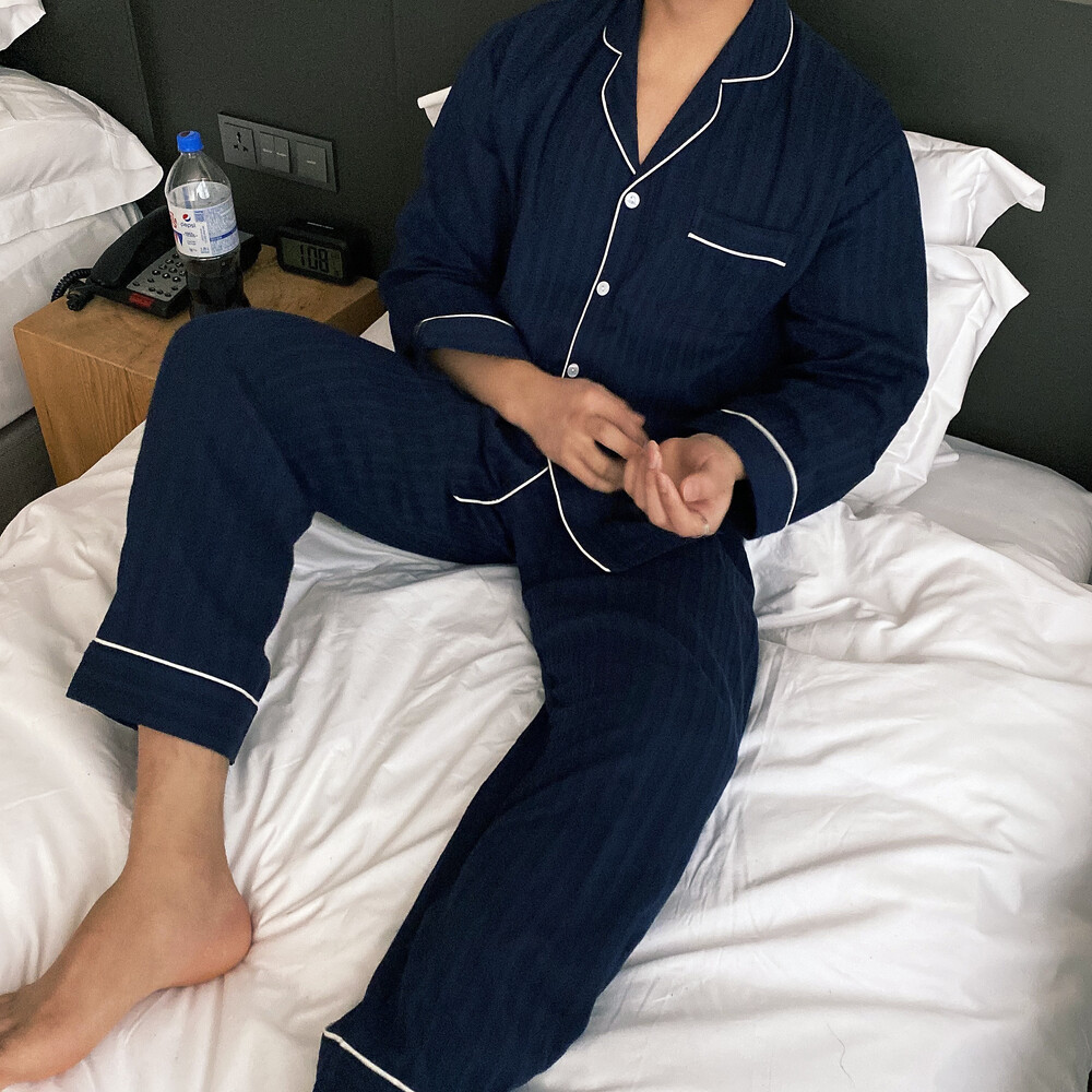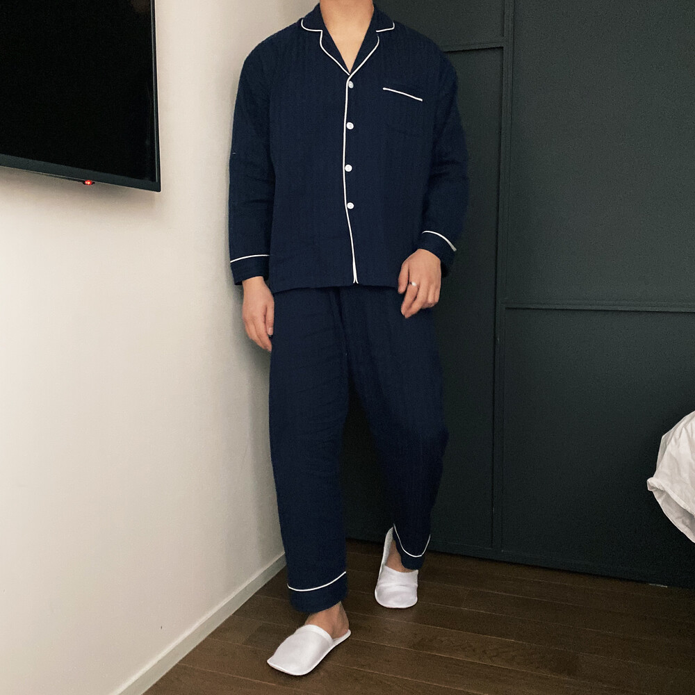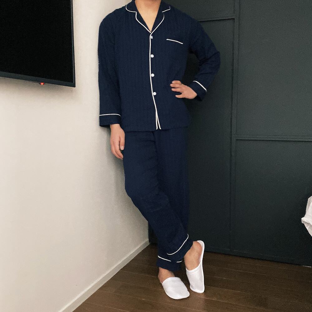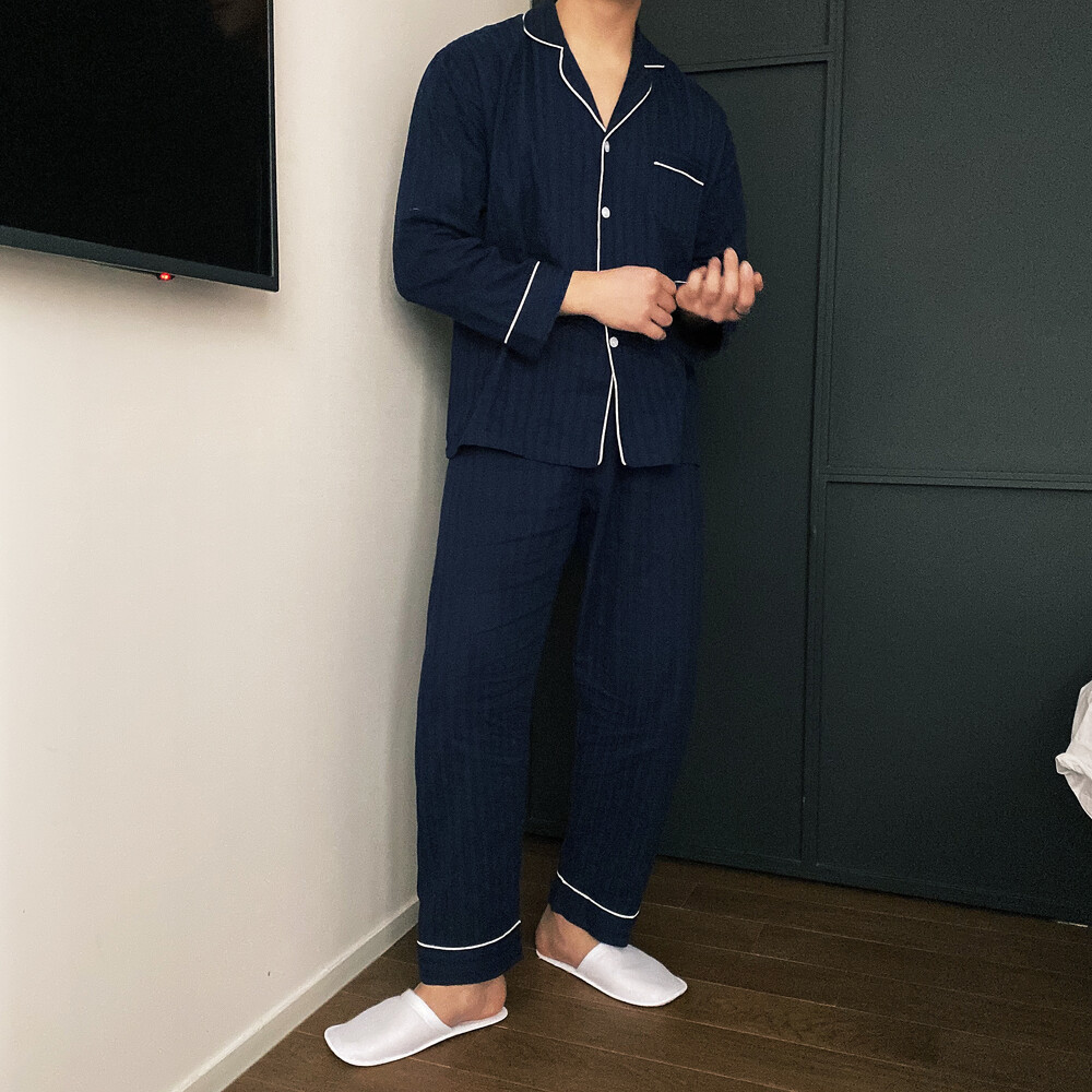네이비 컬러의 세로줄 패턴으로 편안함은 물론 섹시함까지 챙겨가는 파자마 셋업입니다