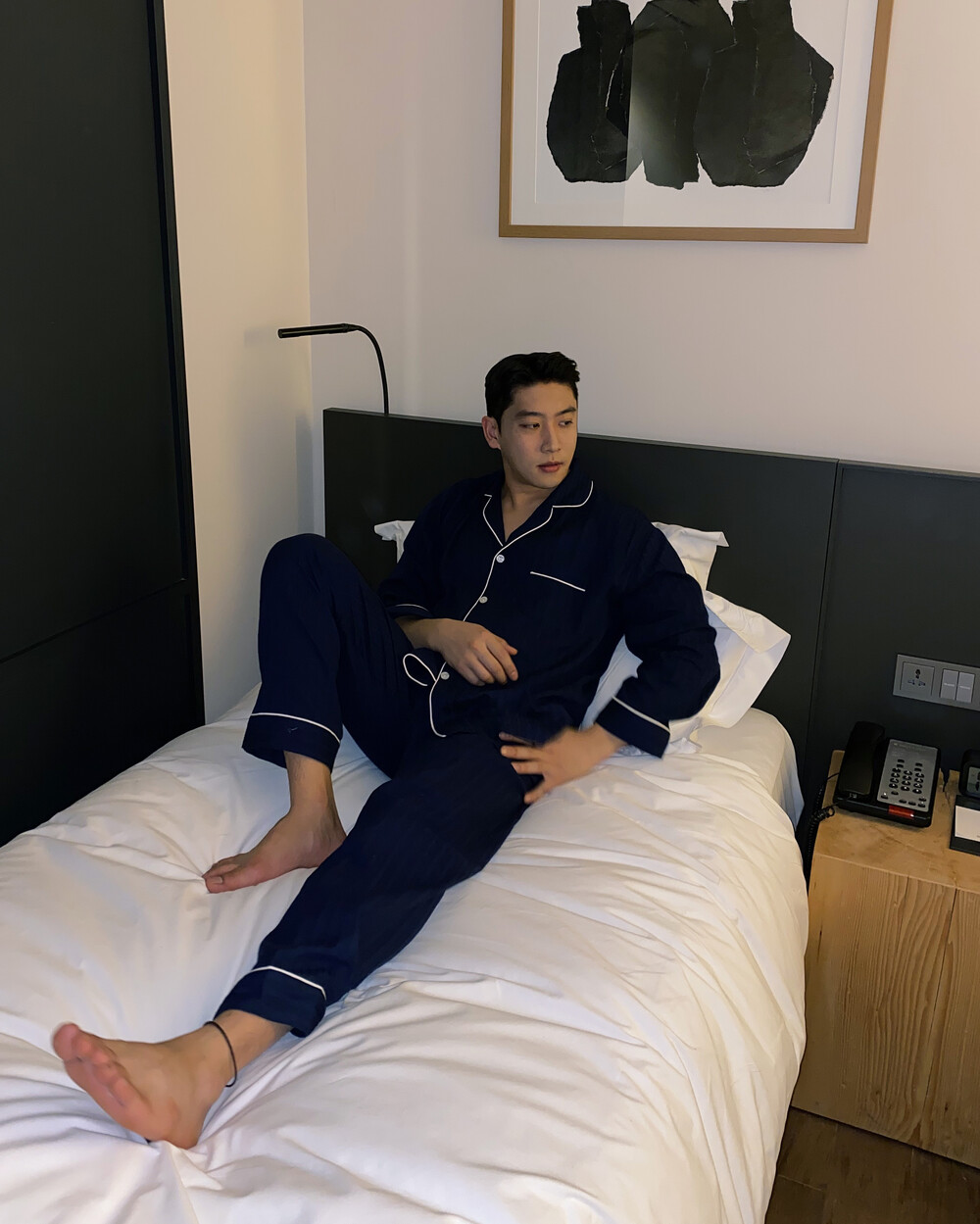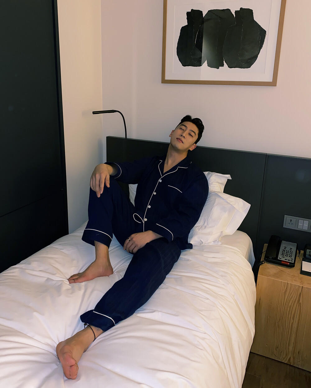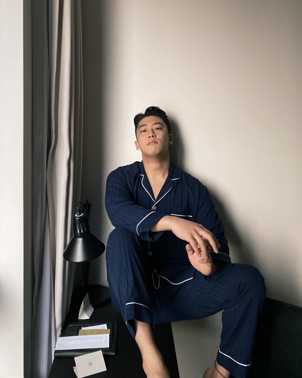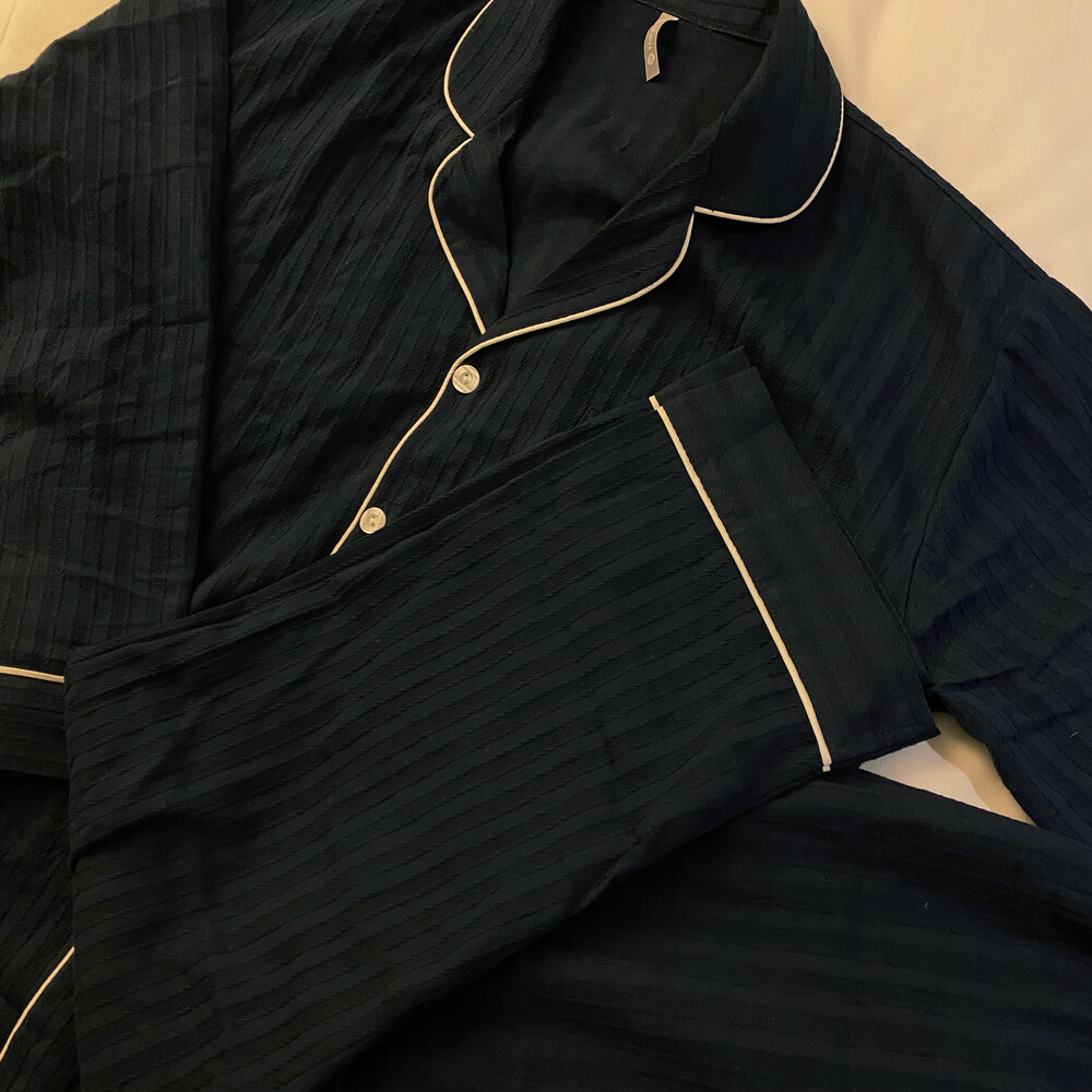 네이비 컬러의 세로줄 패턴으로 편안함은 물론 섹시함까지 챙겨가는 파자마 셋업입니다