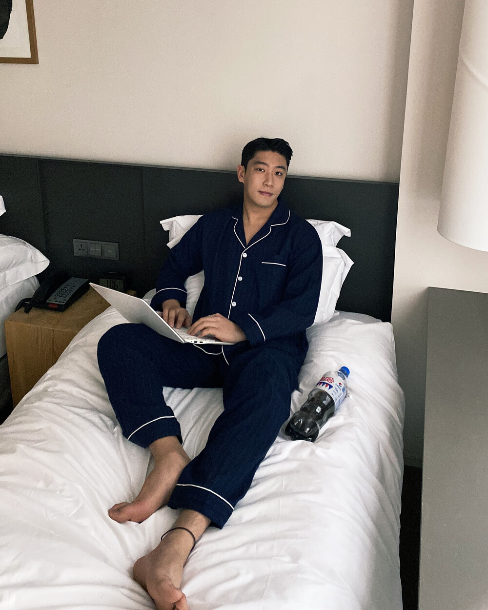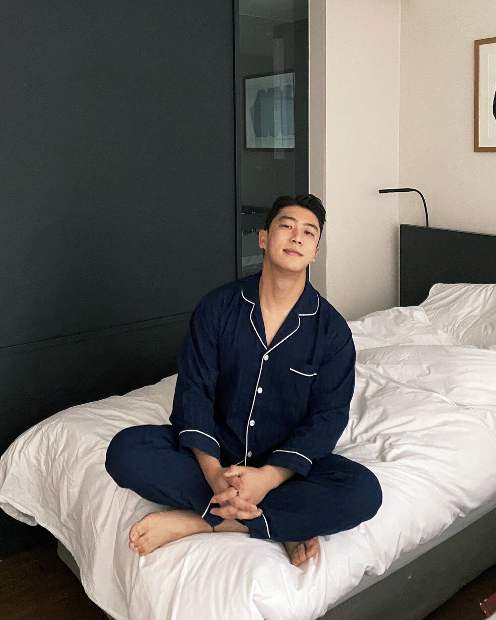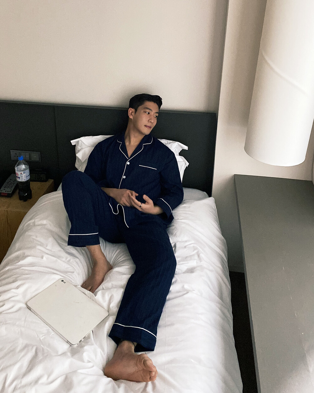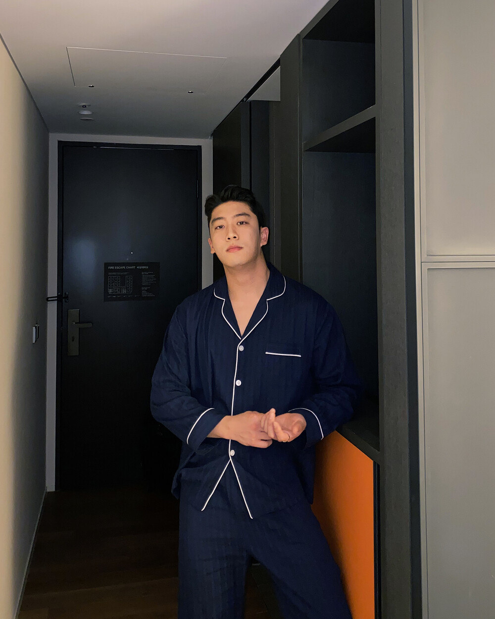 네이비 컬러의 세로줄 패턴으로 편안함은 물론 섹시함까지 챙겨가는 파자마 셋업입니다