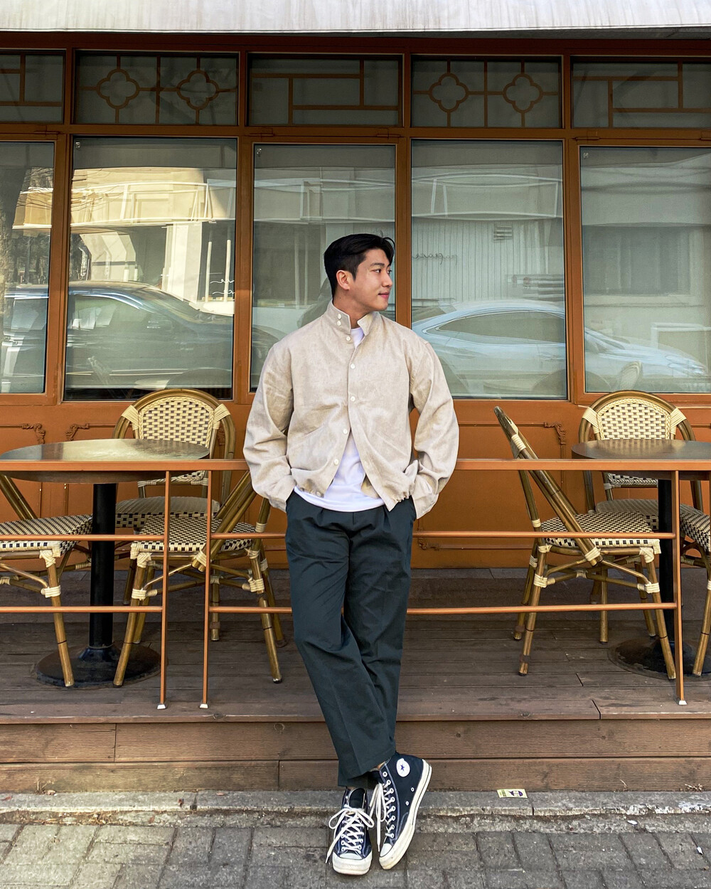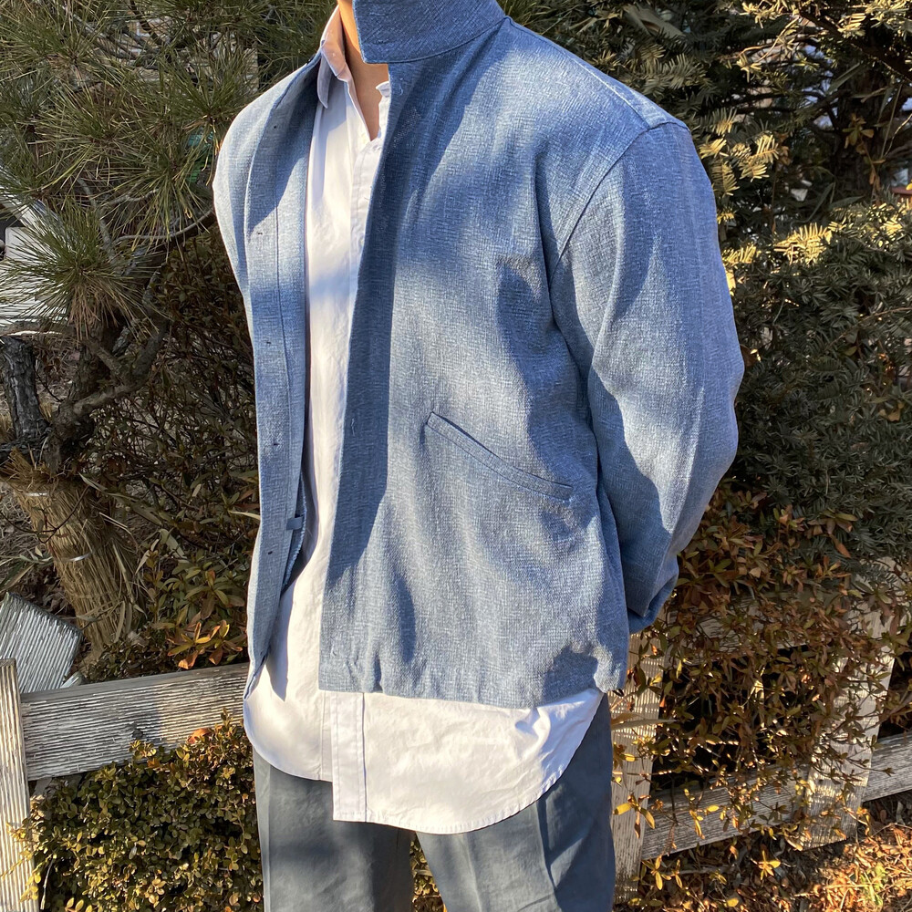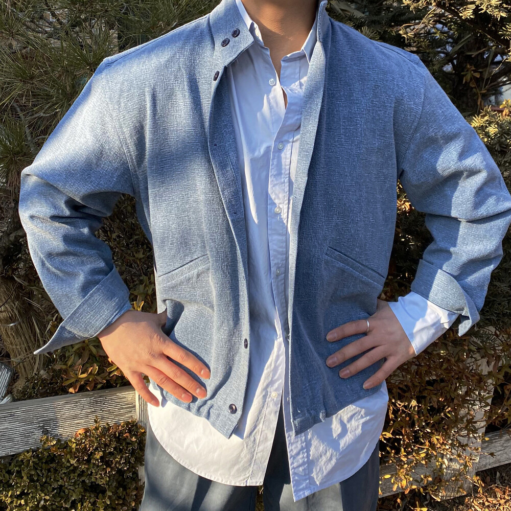 넥라인이 버튼으로 반목정도까지 올라오는 하이넥 자켓입니다