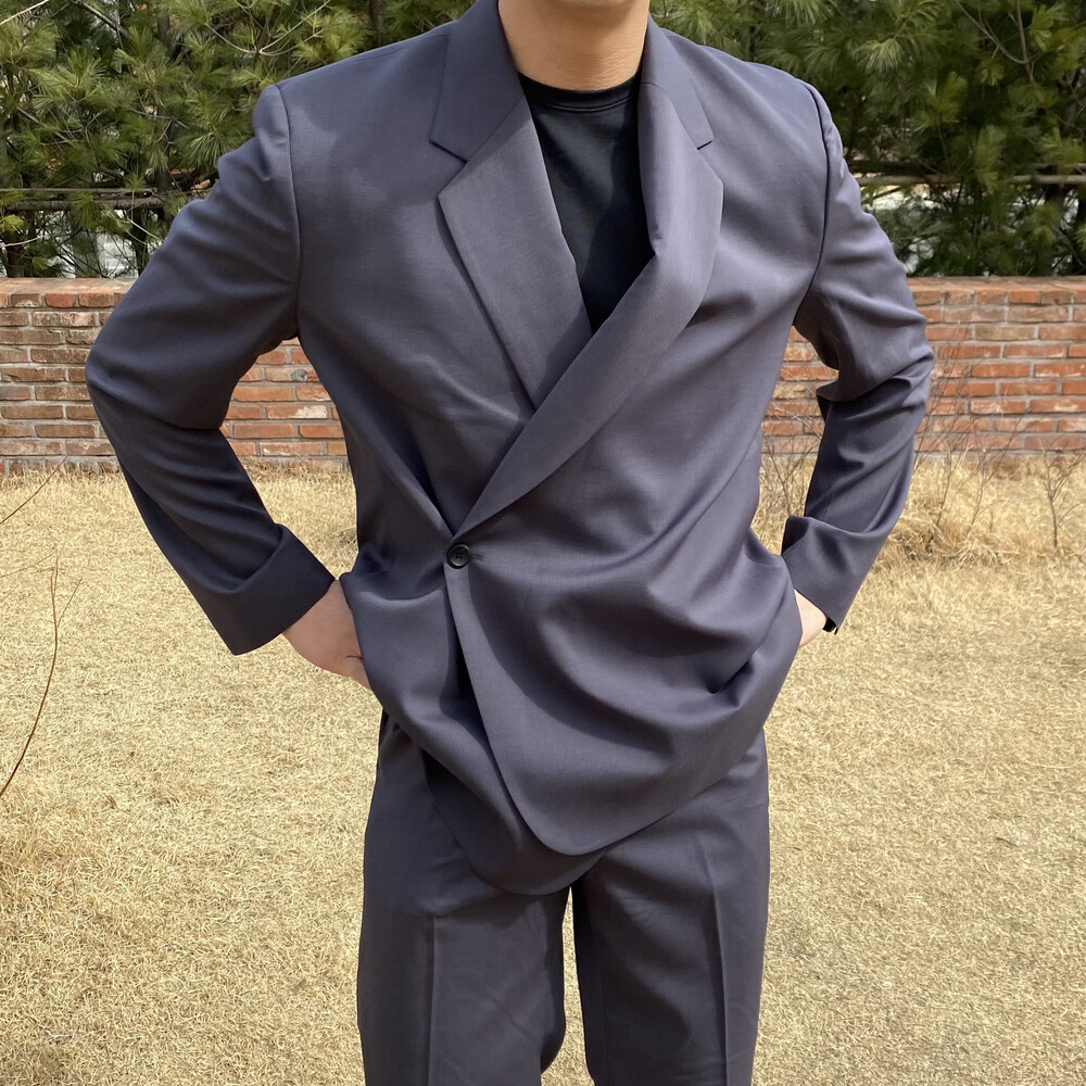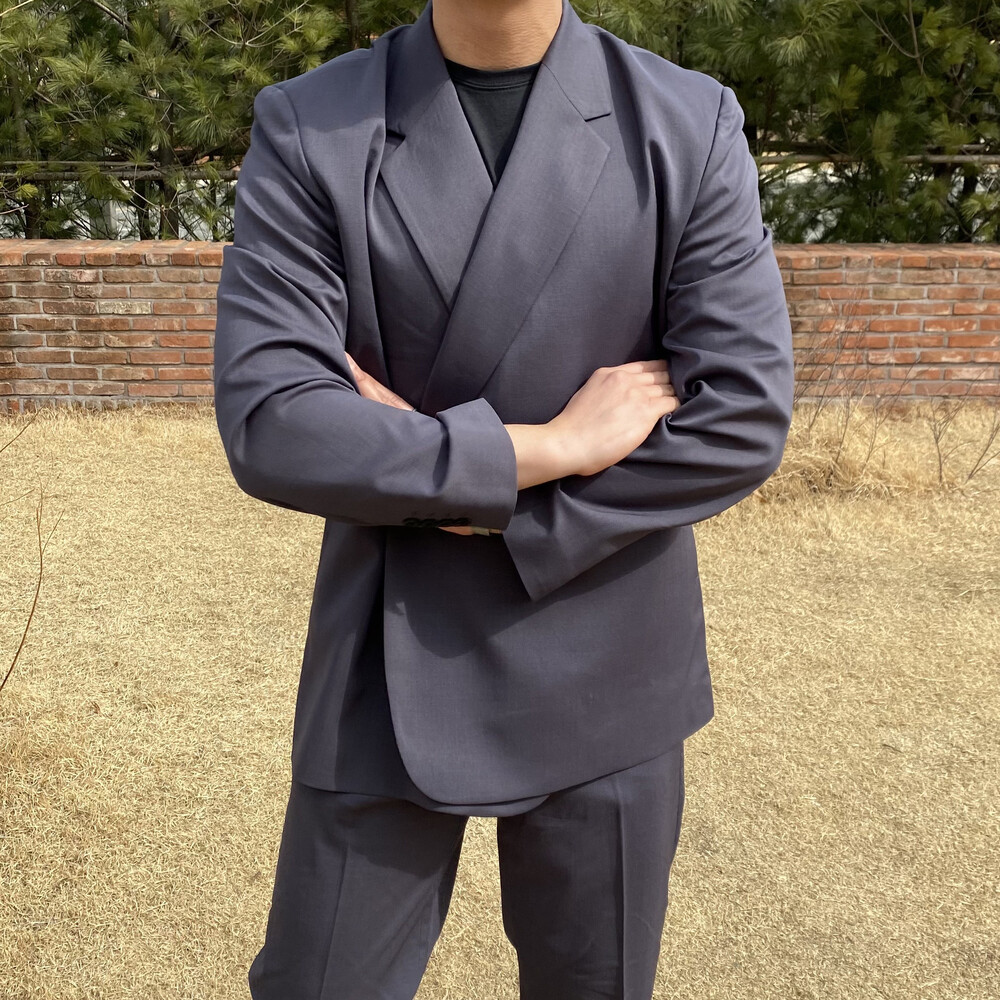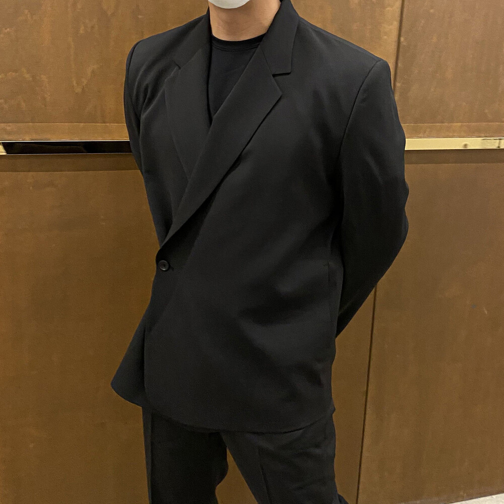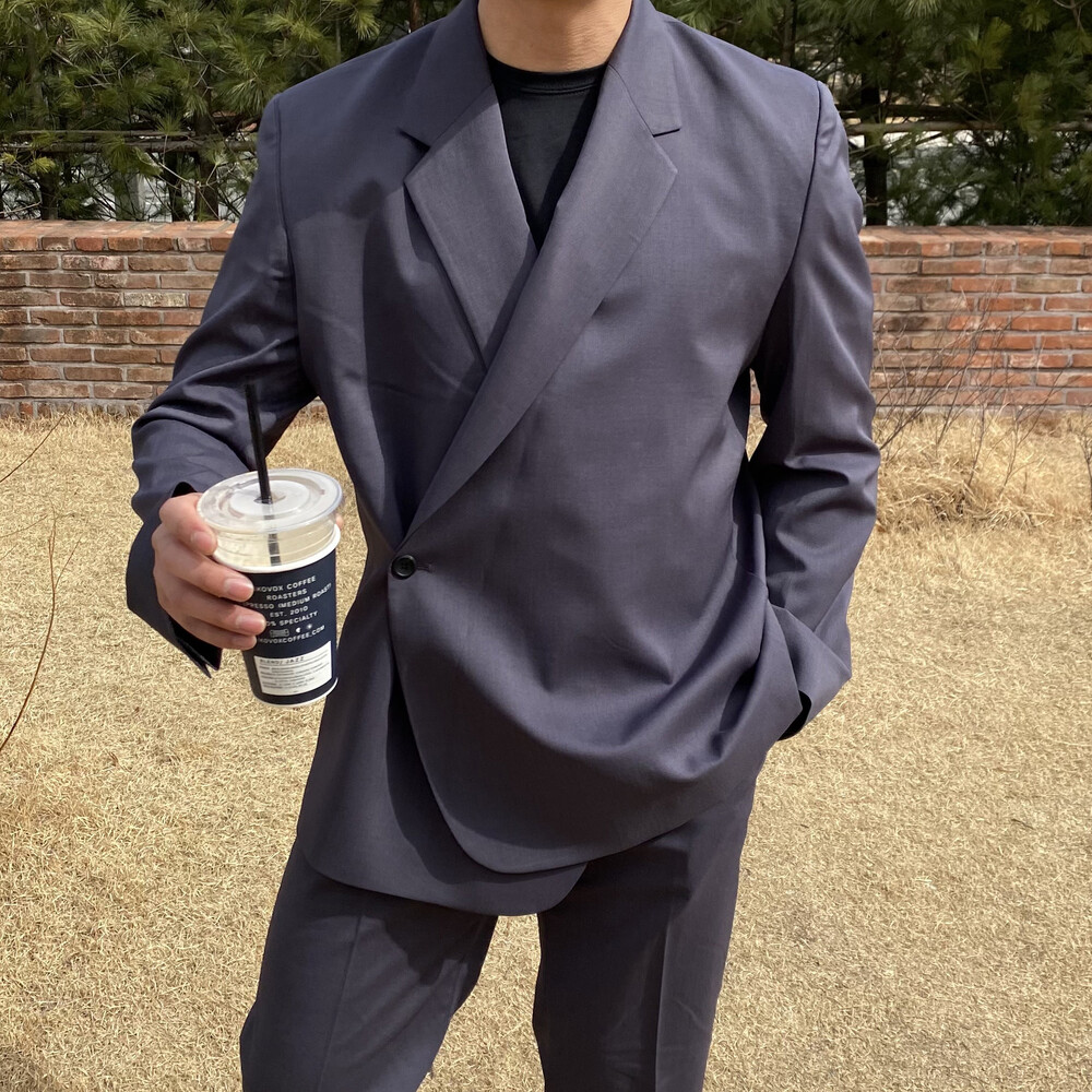 블랙과 차콜의 무채색 컬러가 섹시한 느낌까지 내주면서 일반적인 자켓과는 달라서 디자인자체가 포인트가 되어주는 셋업이에요
