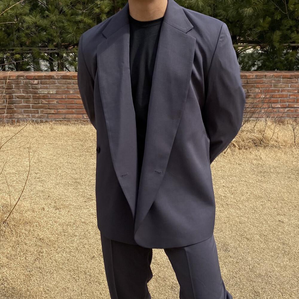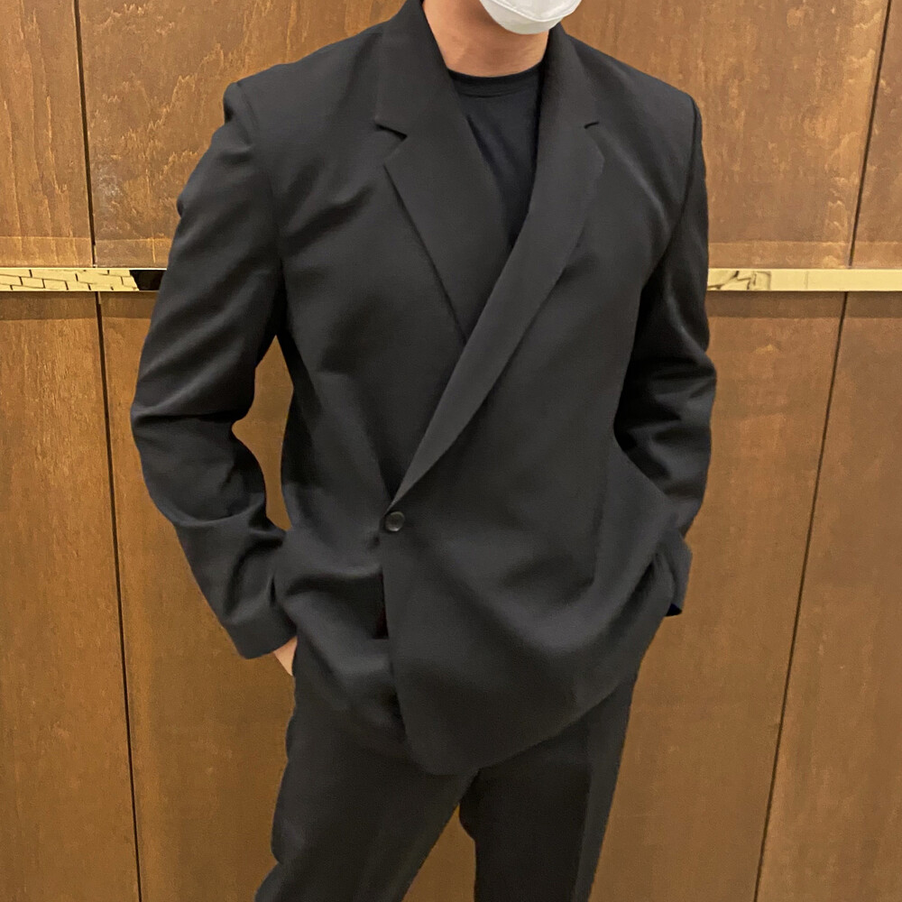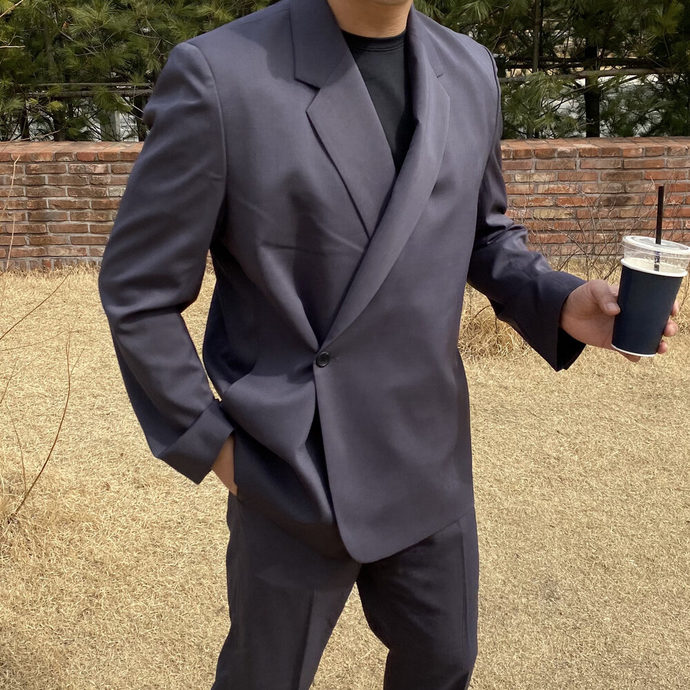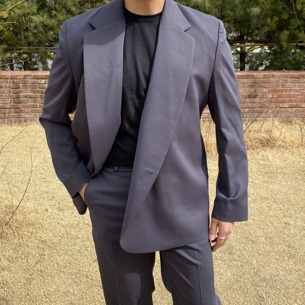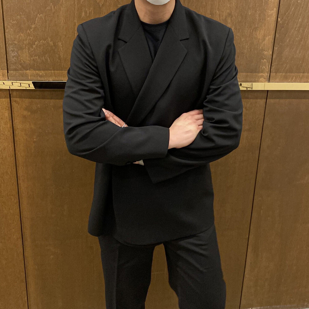 블랙과 차콜의 무채색 컬러가 섹시한 느낌까지 내주면서 일반적인 자켓과는 달라서 디자인자체가 포인트가 되어주는 셋업이에요