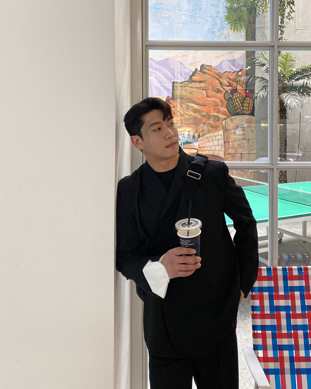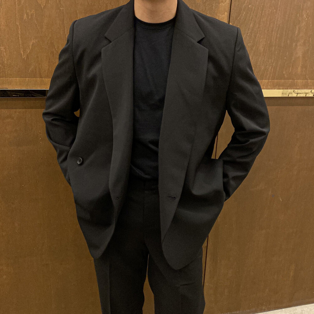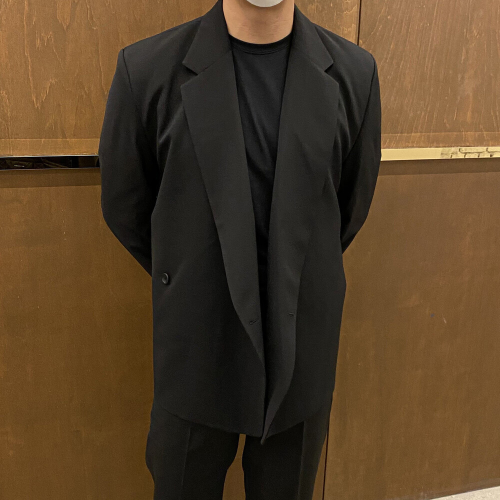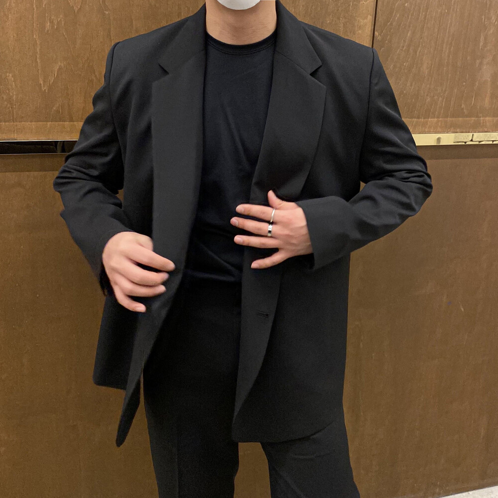 블랙과 차콜의 무채색 컬러가 섹시한 느낌까지 내주면서 일반적인 자켓과는 달라서 디자인자체가 포인트가 되어주는 셋업이에요
