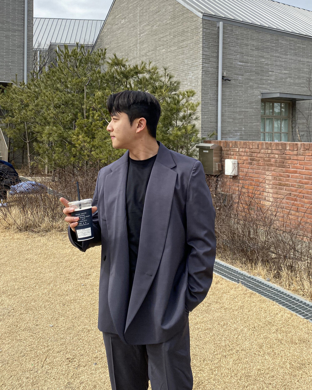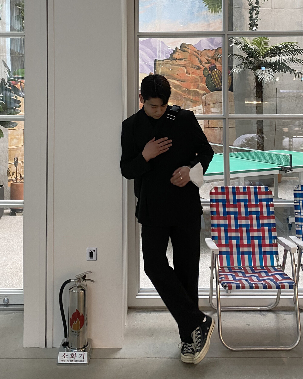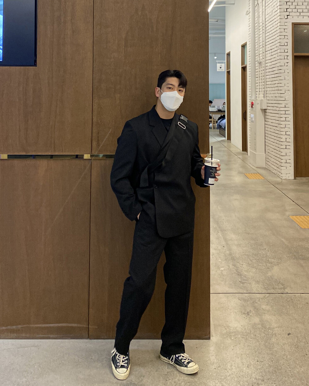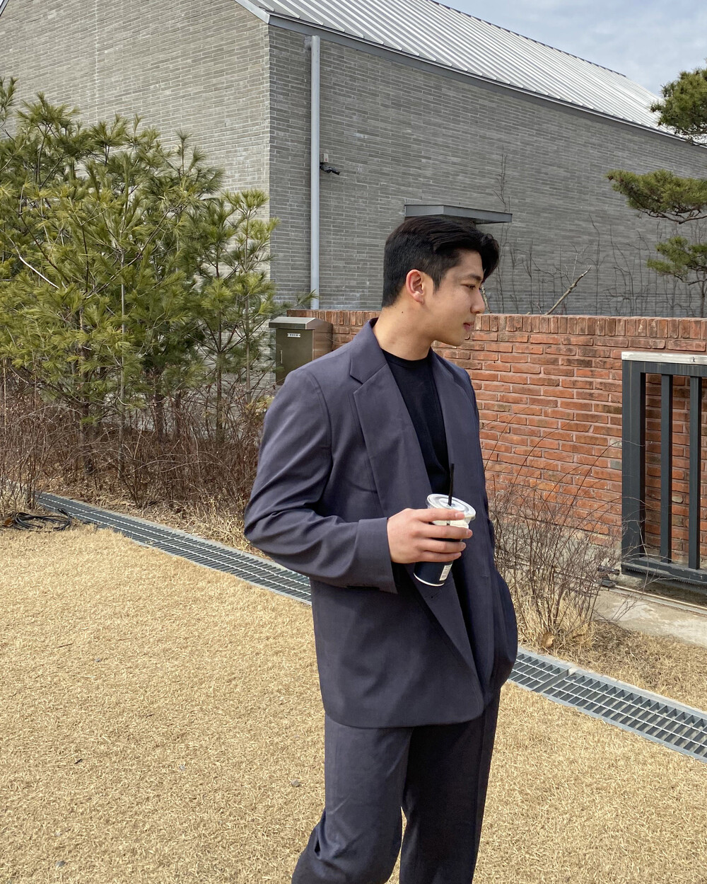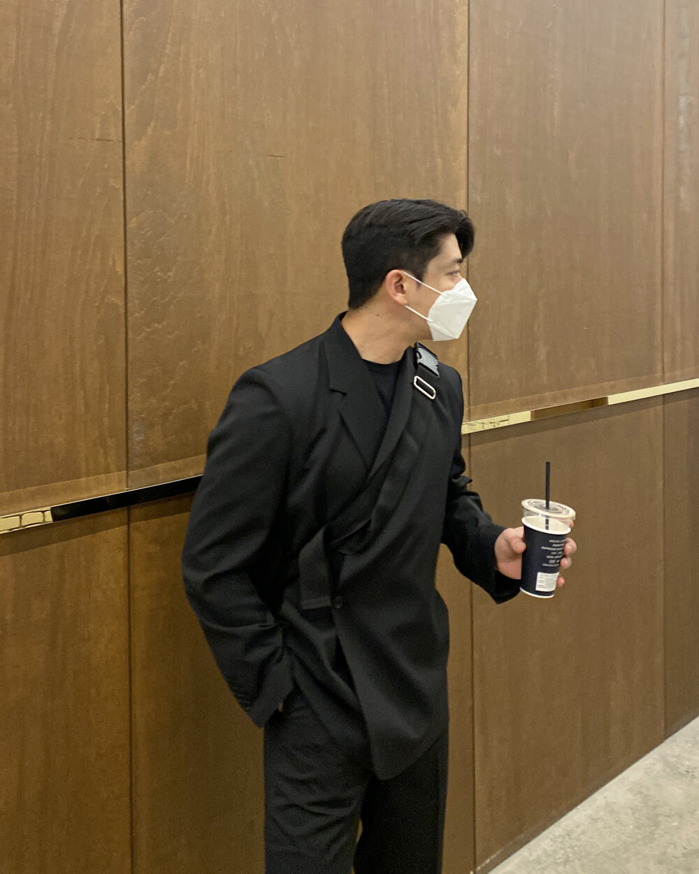 블랙과 차콜의 무채색 컬러가 섹시한 느낌까지 내주면서 일반적인 자켓과는 달라서 디자인자체가 포인트가 되어주는 셋업이에요