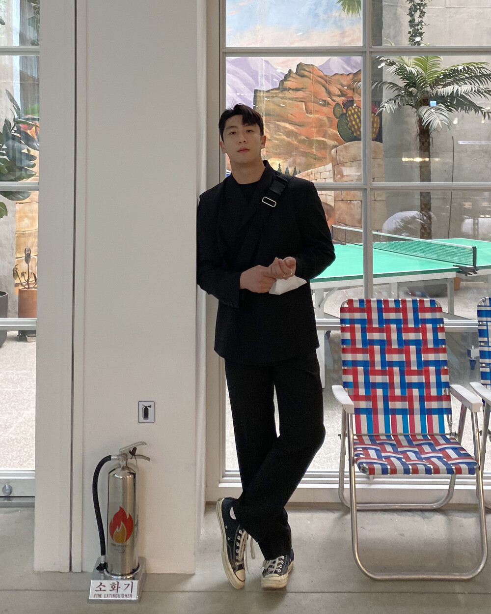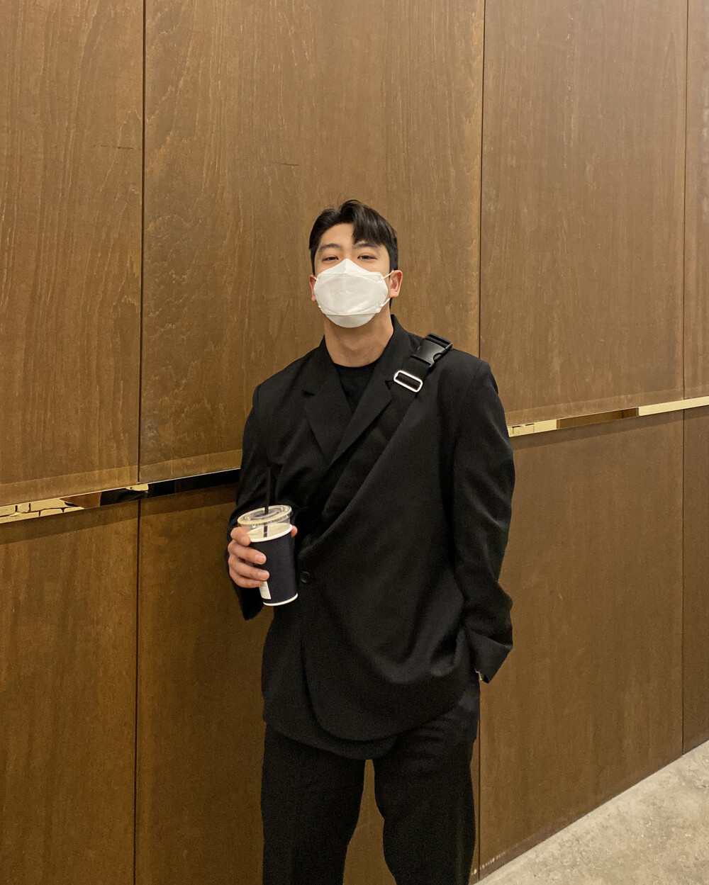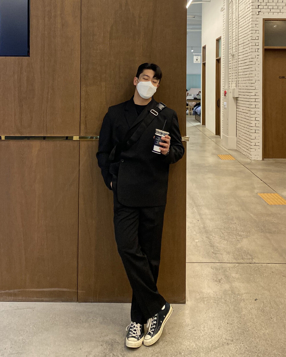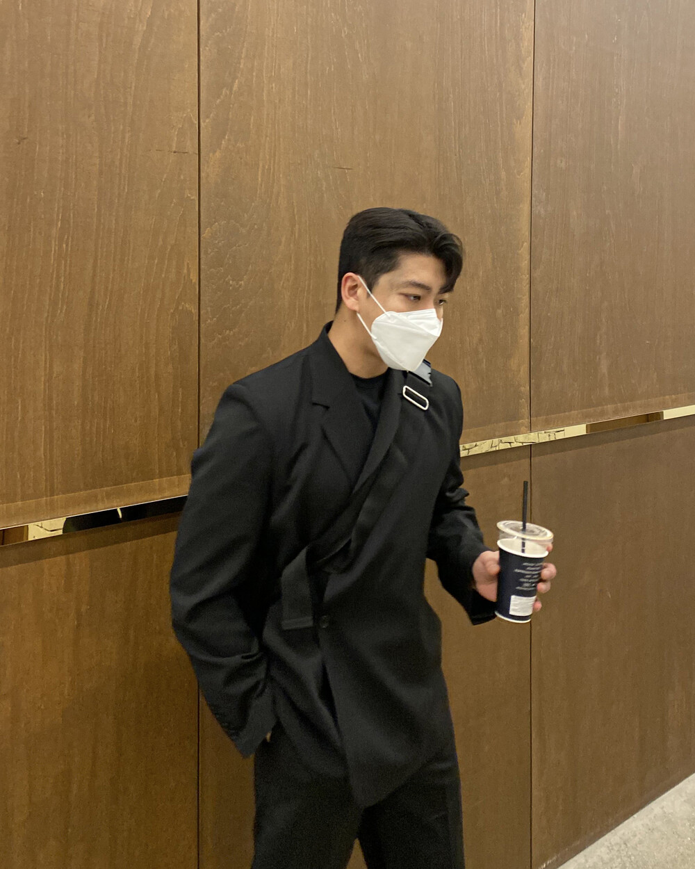 블랙과 차콜의 무채색 컬러가 섹시한 느낌까지 내주면서 일반적인 자켓과는 달라서 디자인자체가 포인트가 되어주는 셋업이에요