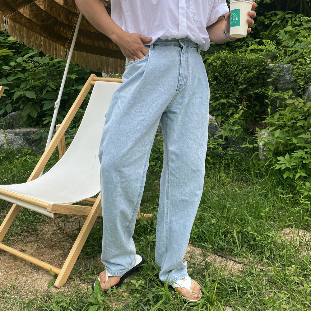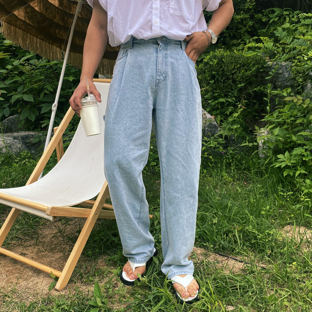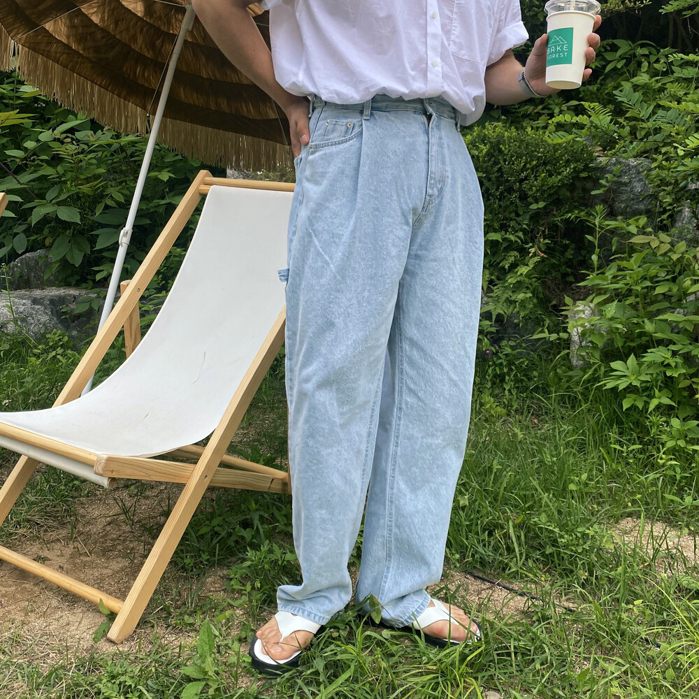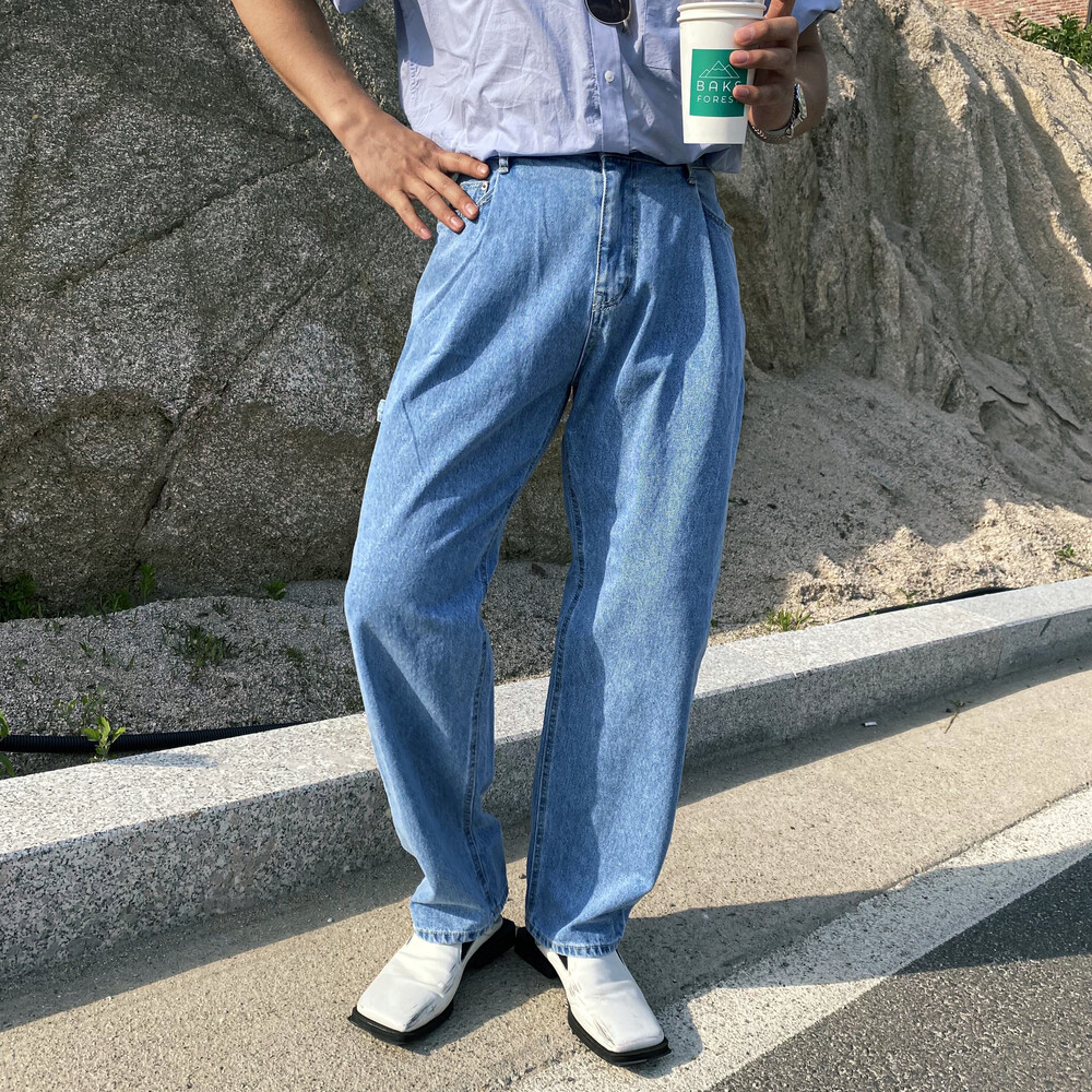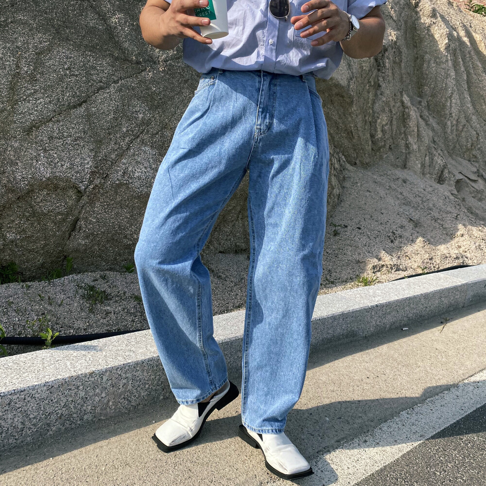 허리부분 핀턱이 잡혀 배바지했을때의 포인트가 살아나는 와이드 데님팬츠입니다