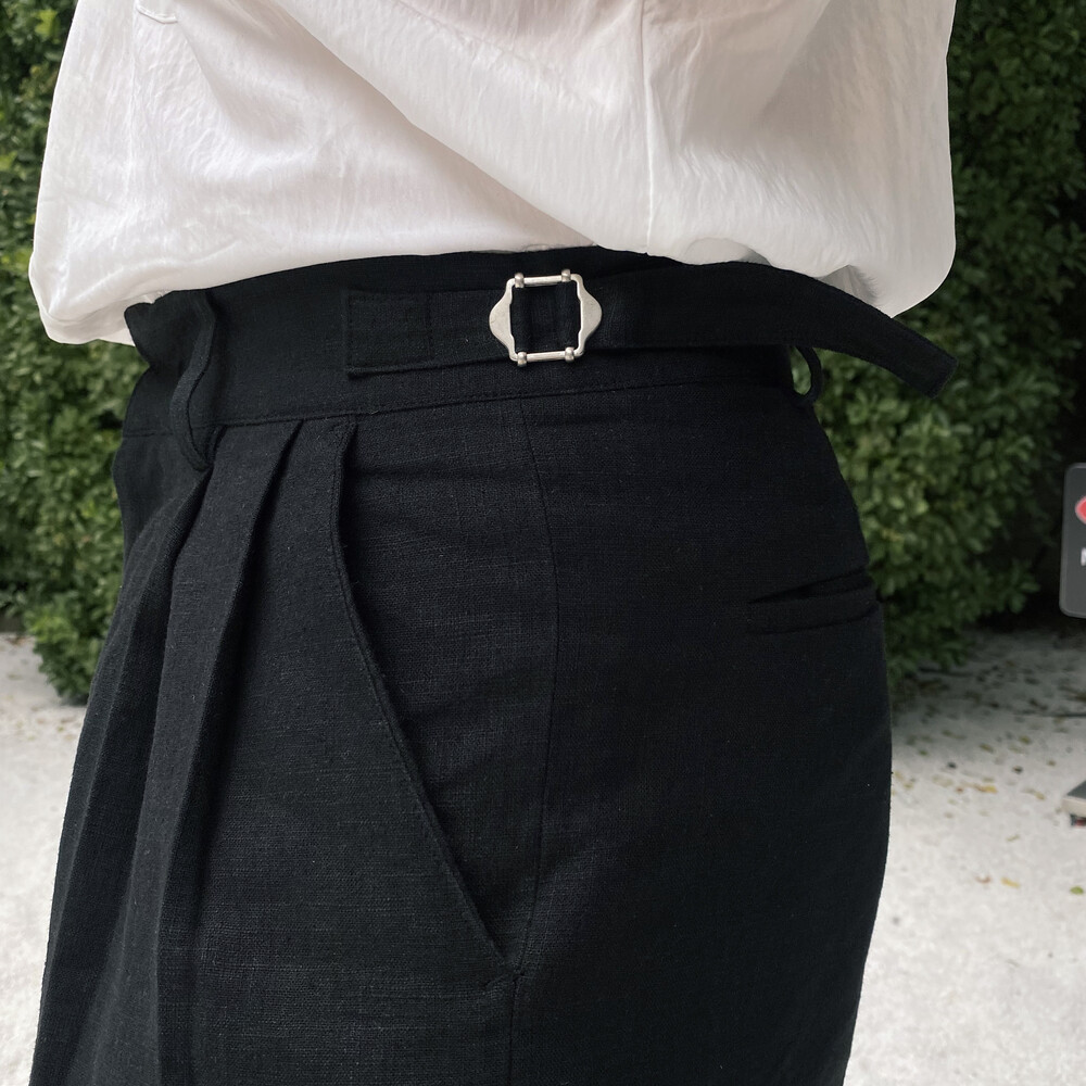 허리에 비조 포인트로 벨트없이도 사이즈 조절이 가능한 슬랙스입니다