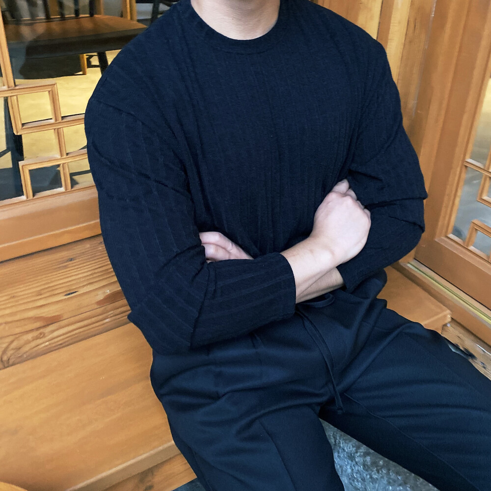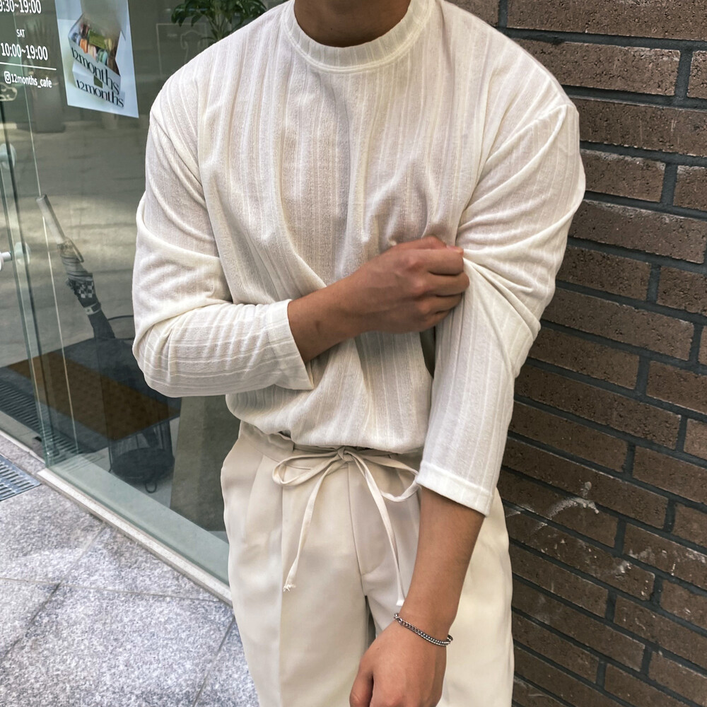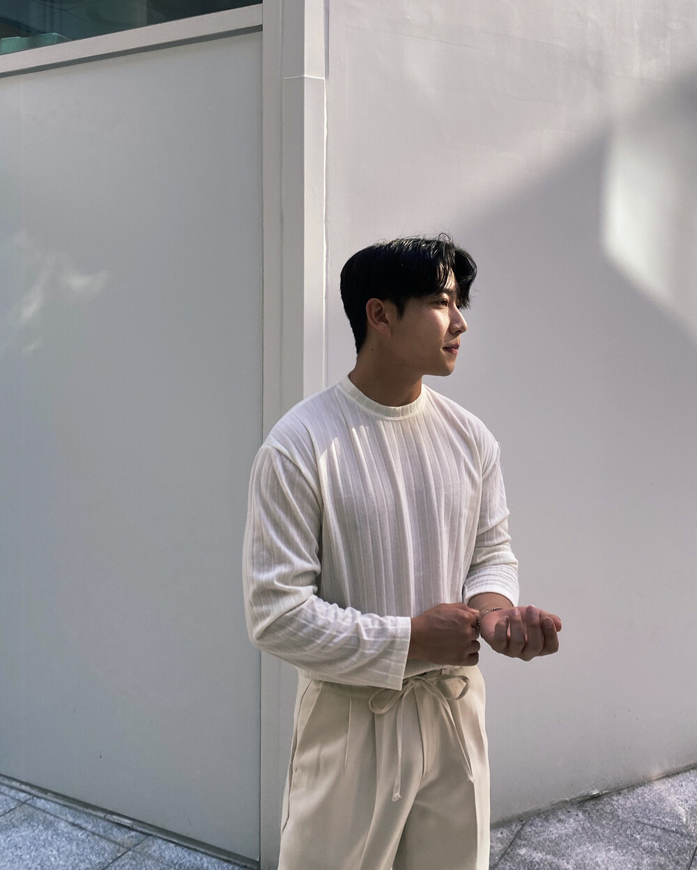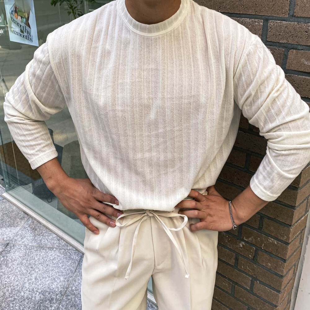 세로 스트라이프 패턴의 보들보들한 레노바 원단 니트티입니다