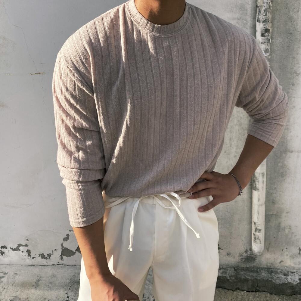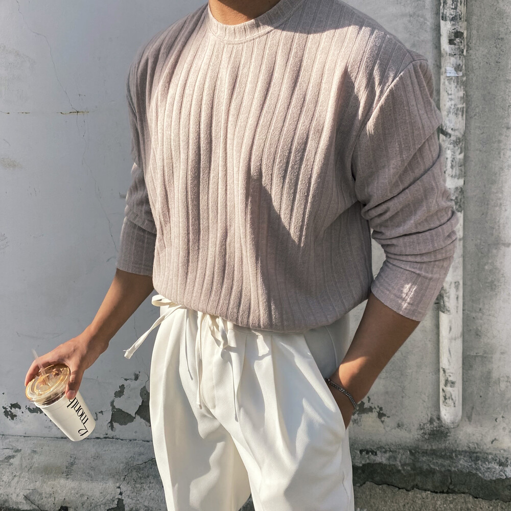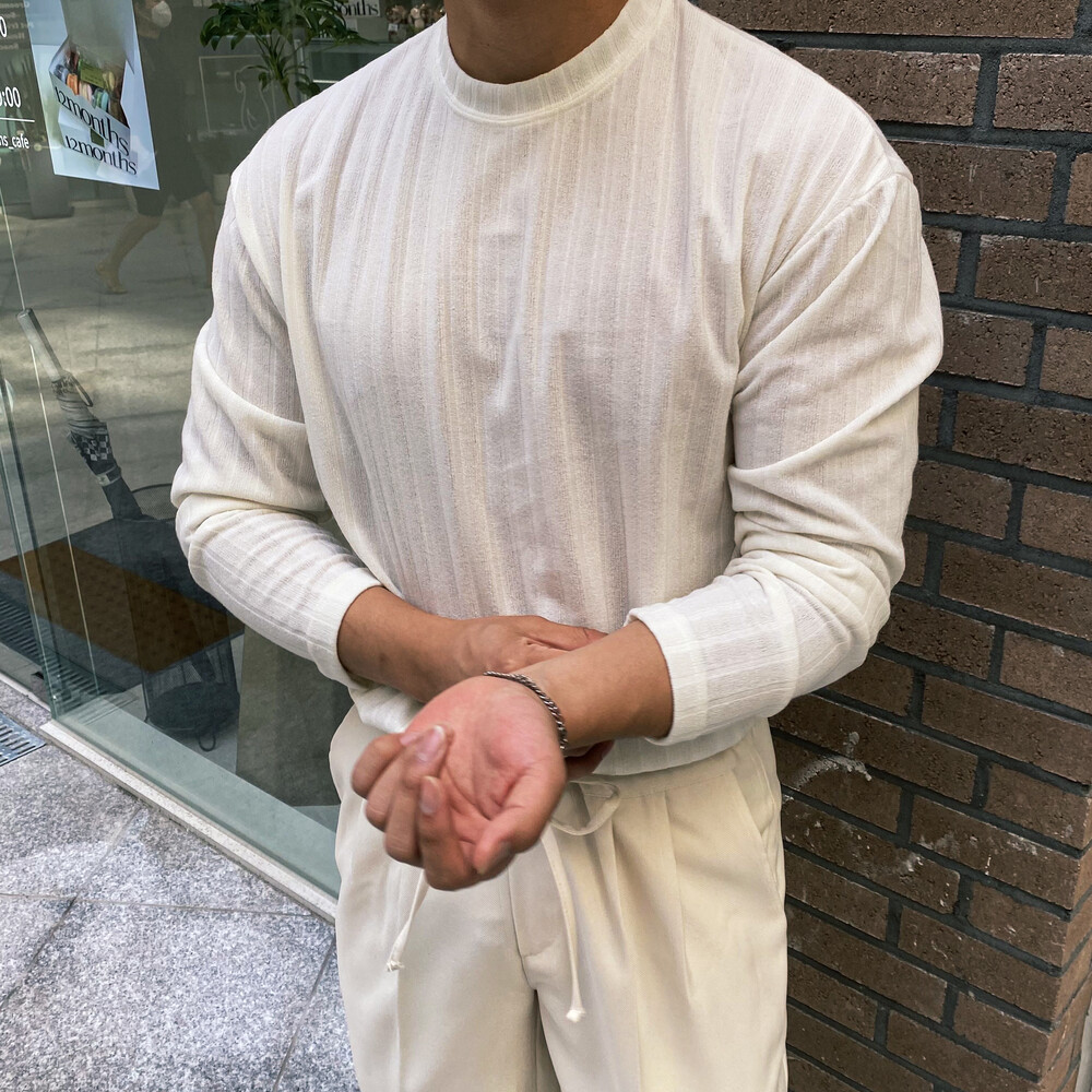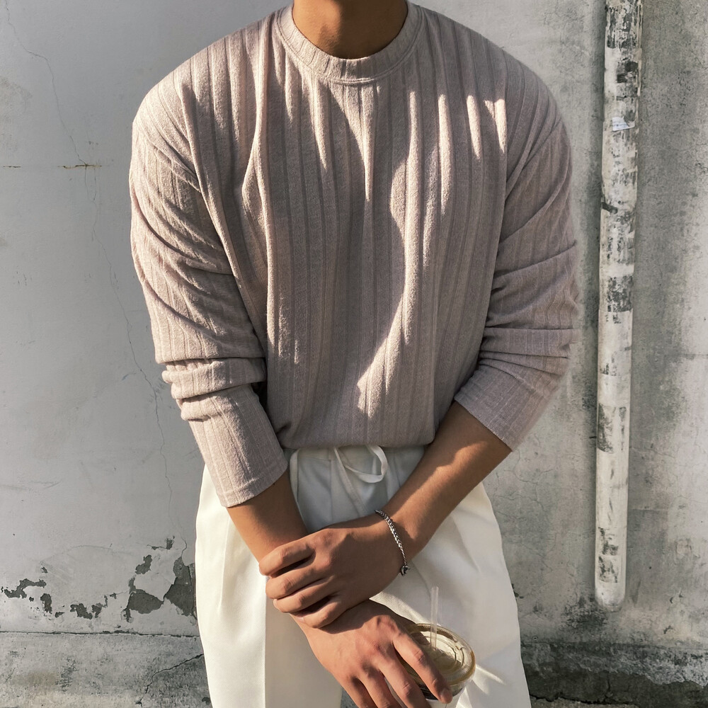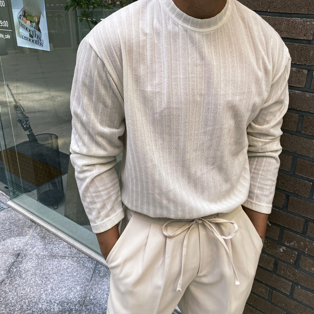 세로 스트라이프 패턴의 보들보들한 레노바 원단 니트티입니다