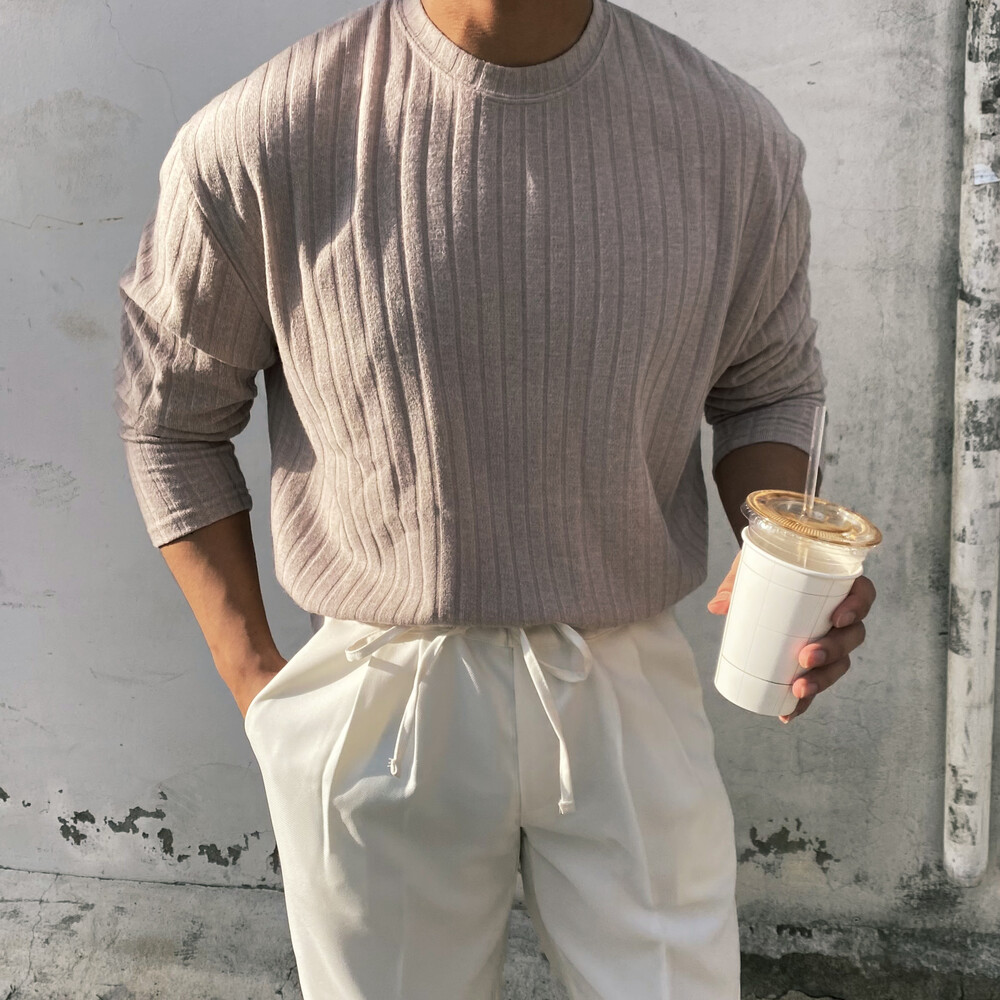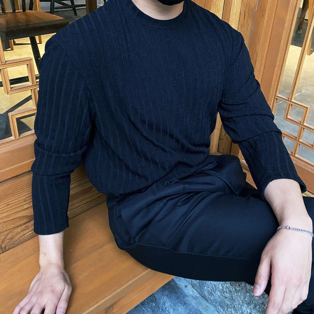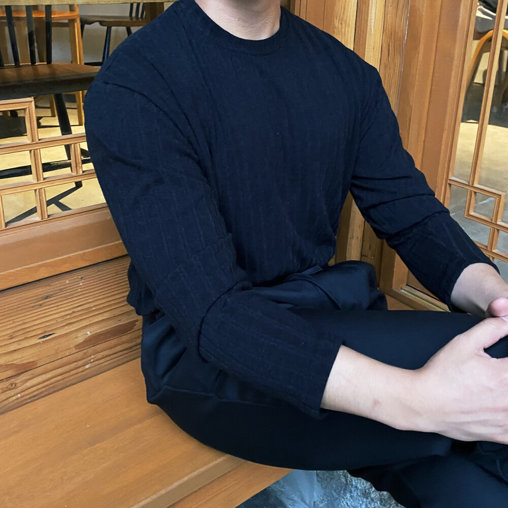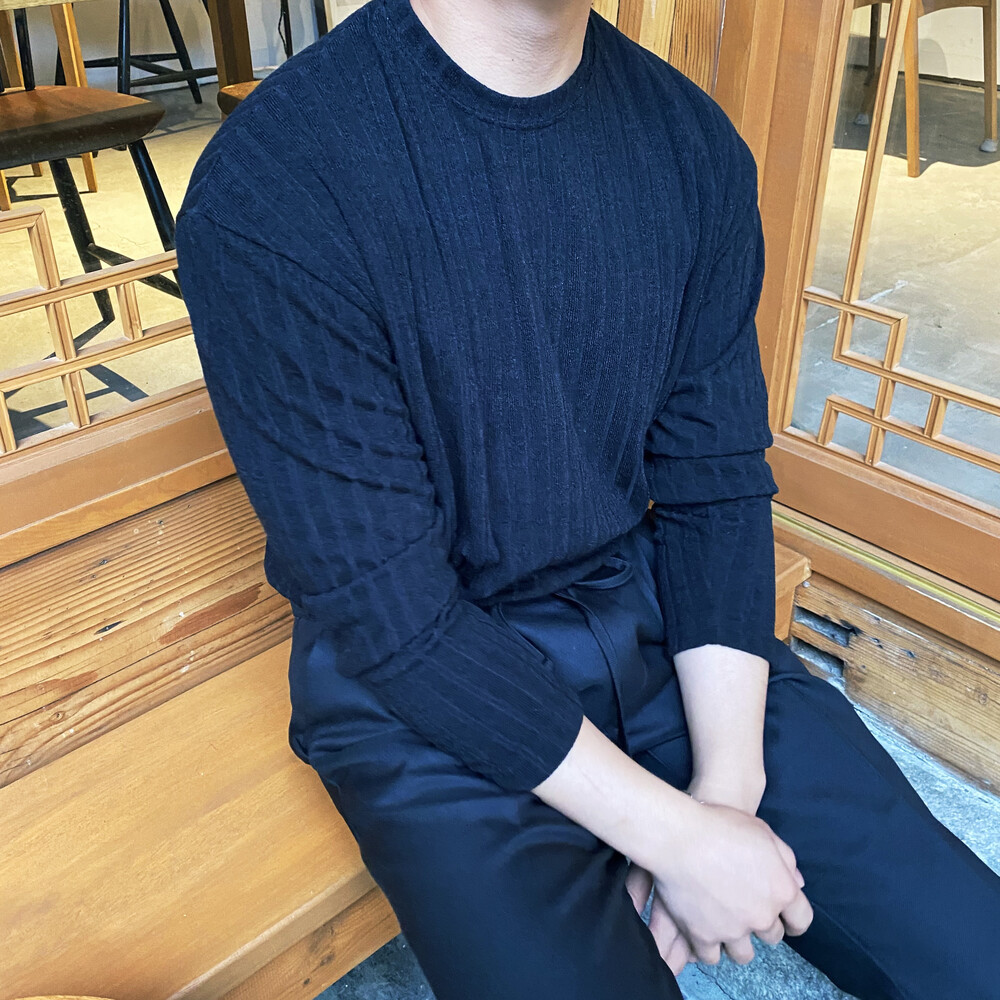 세로 스트라이프 패턴의 보들보들한 레노바 원단 니트티입니다