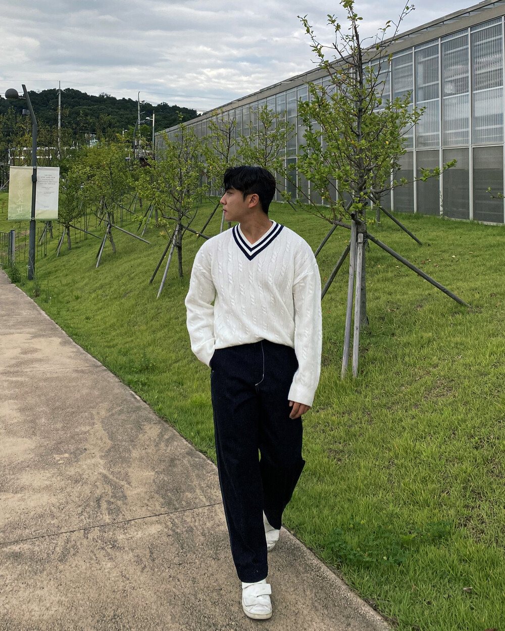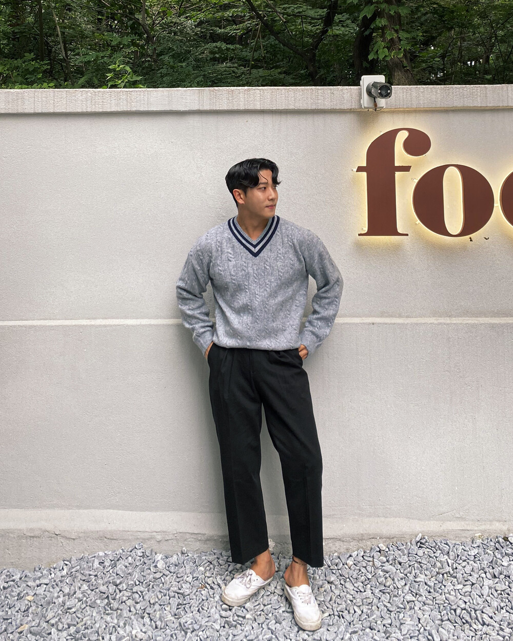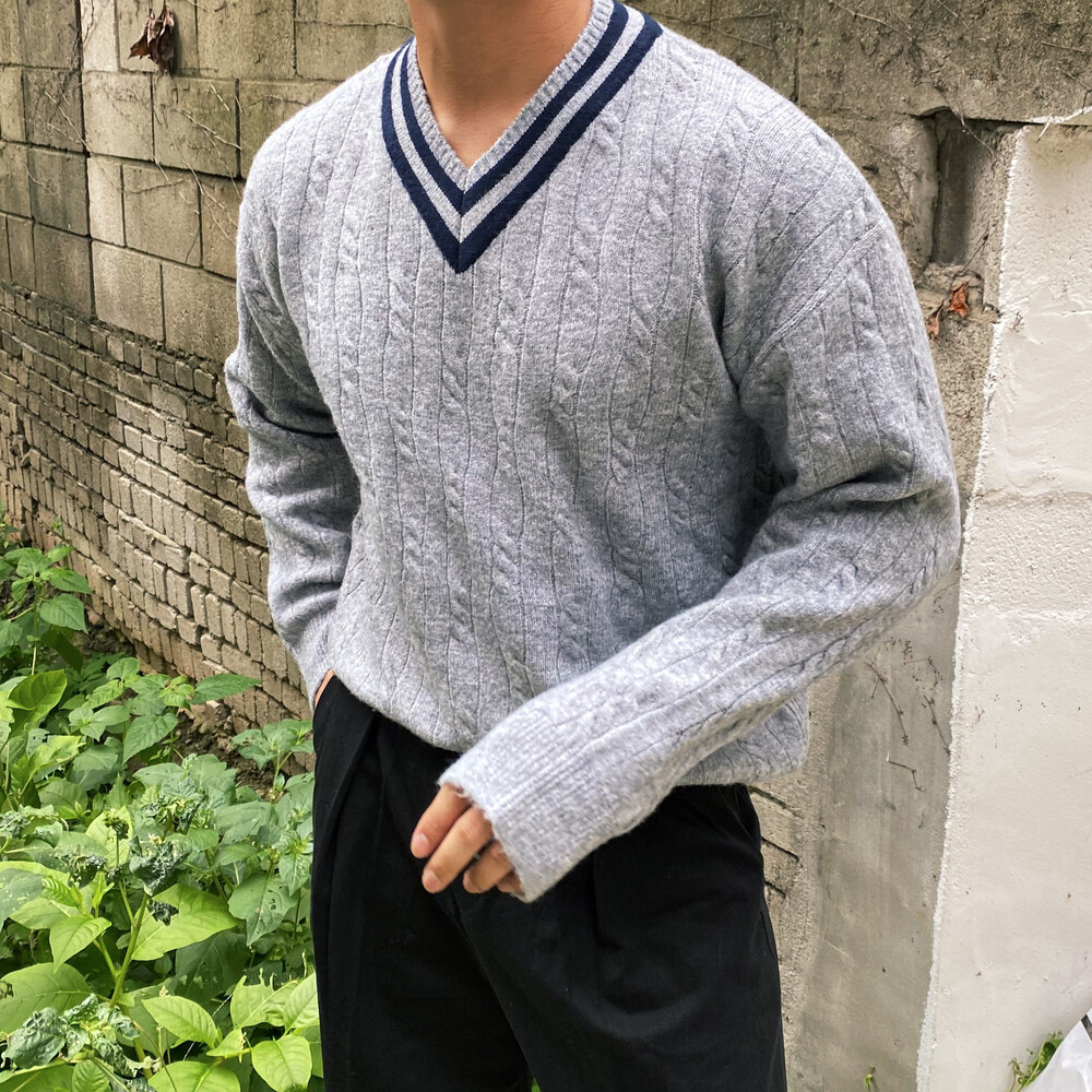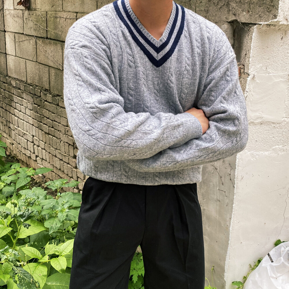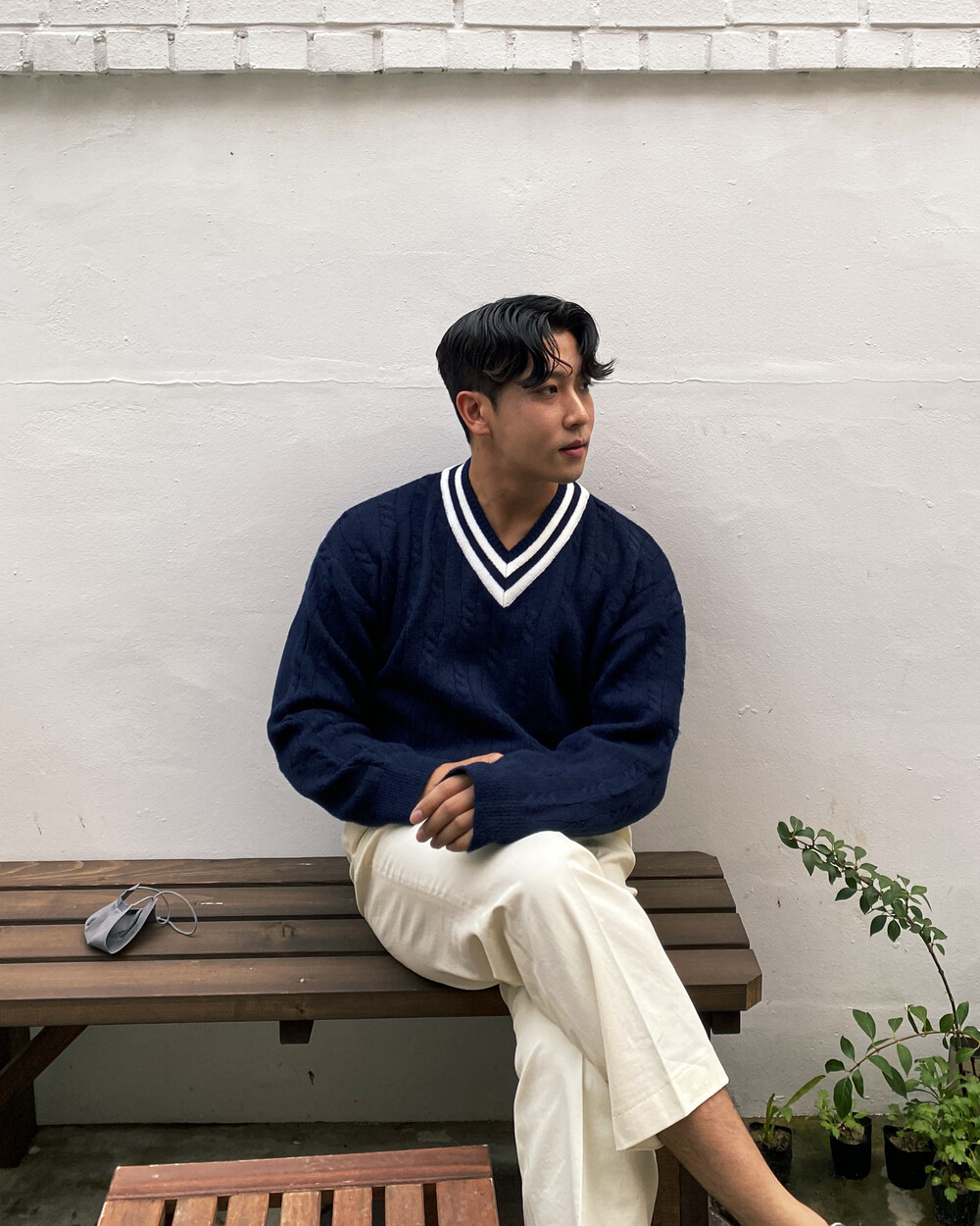 브이넥에 두줄 패턴이 들어가 포인트를 살린 가을 니트 입니다