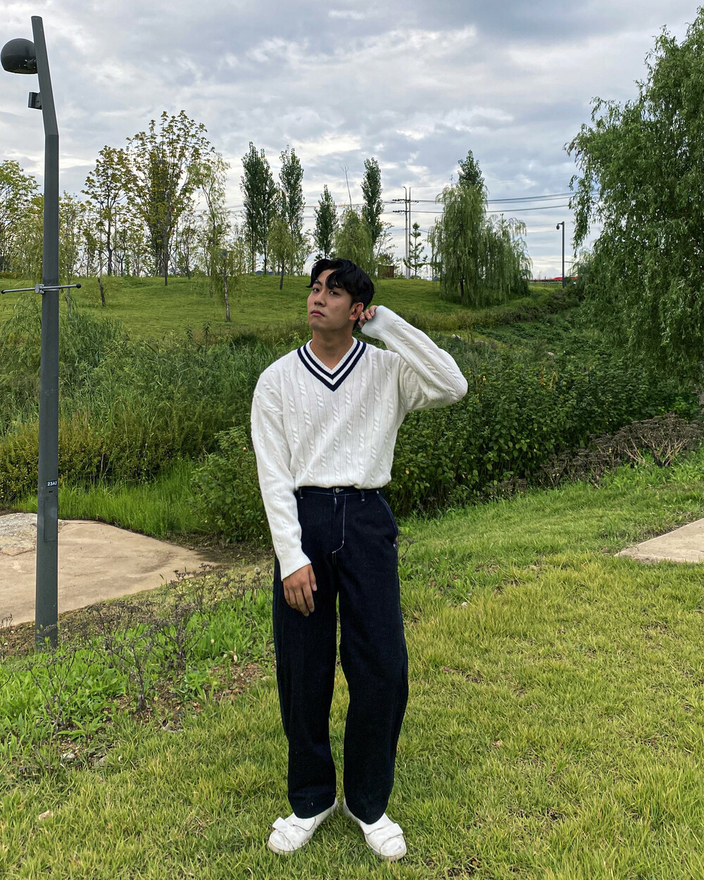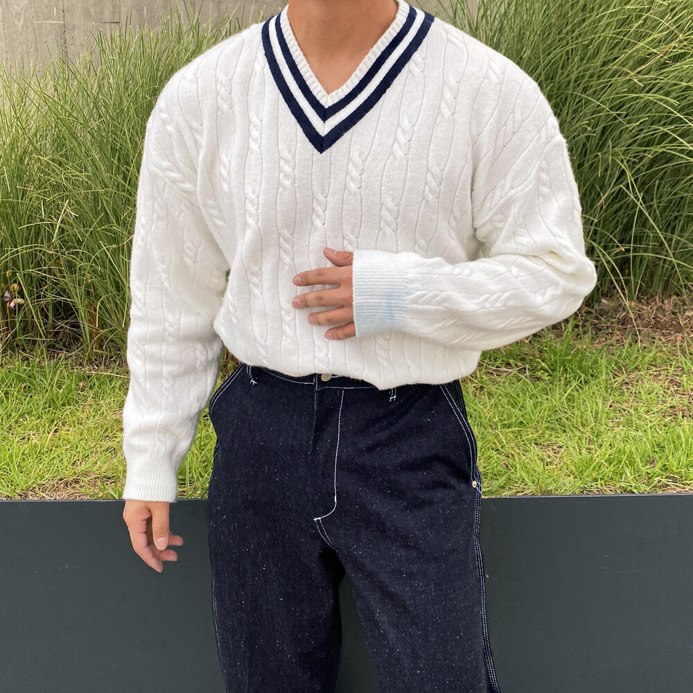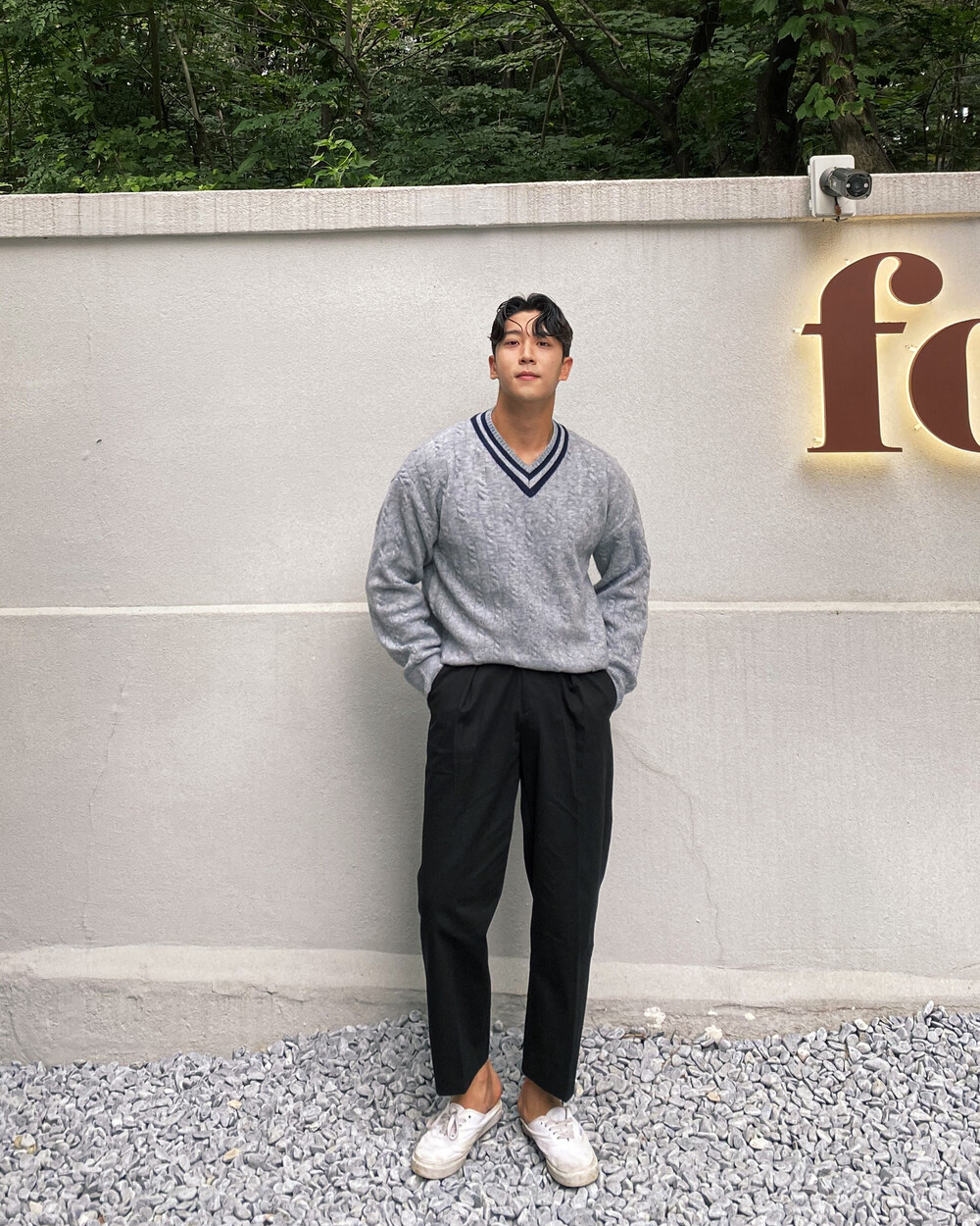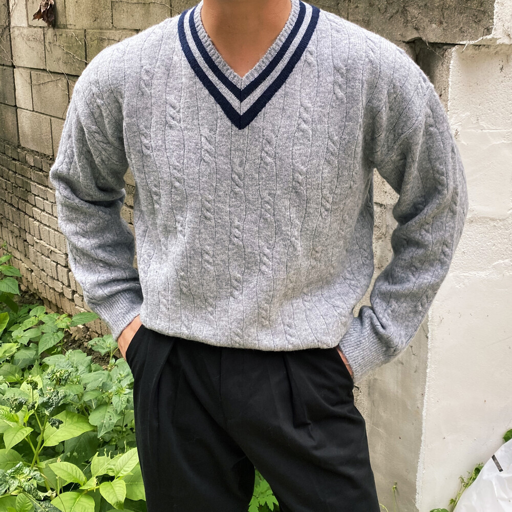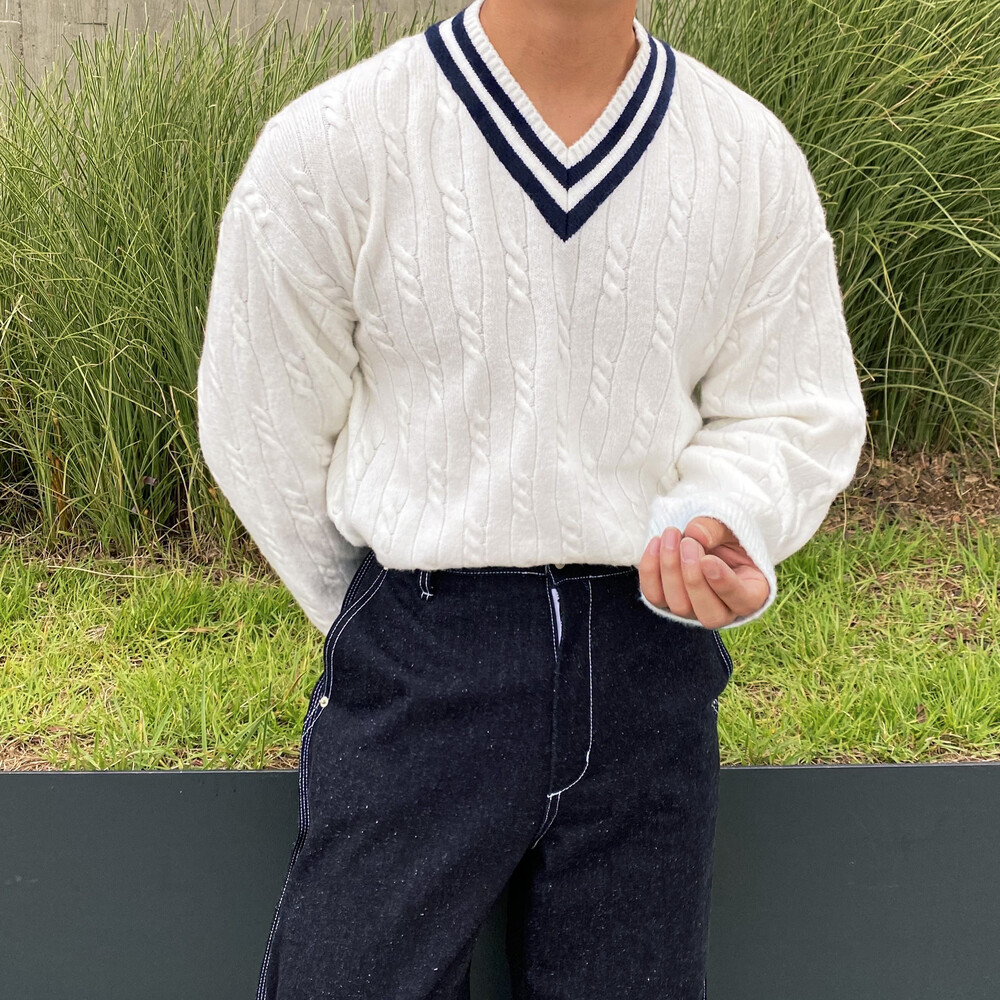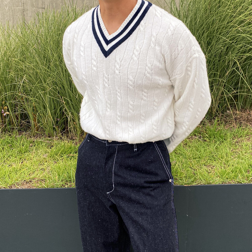 브이넥에 두줄 패턴이 들어가 포인트를 살린 가을 니트 입니다