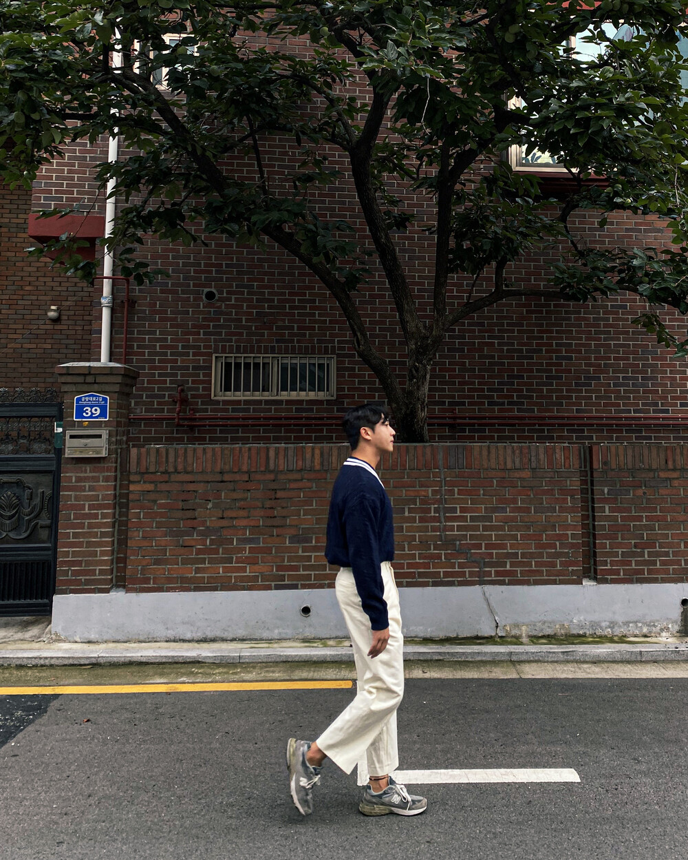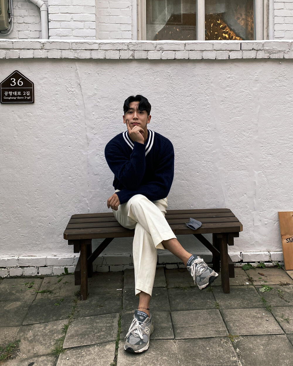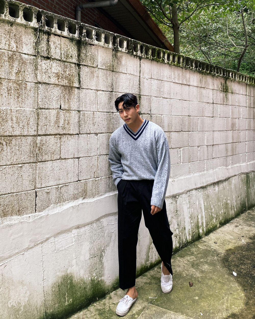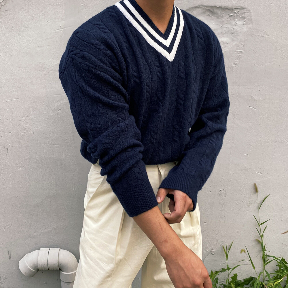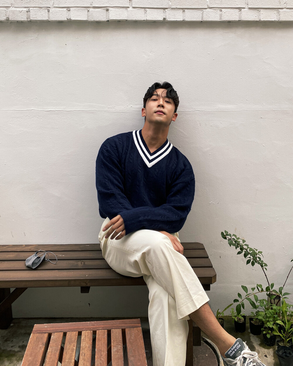 브이넥에 두줄 패턴이 들어가 포인트를 살린 가을 니트 입니다