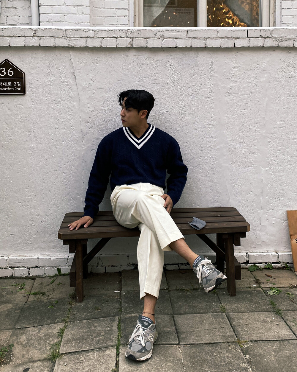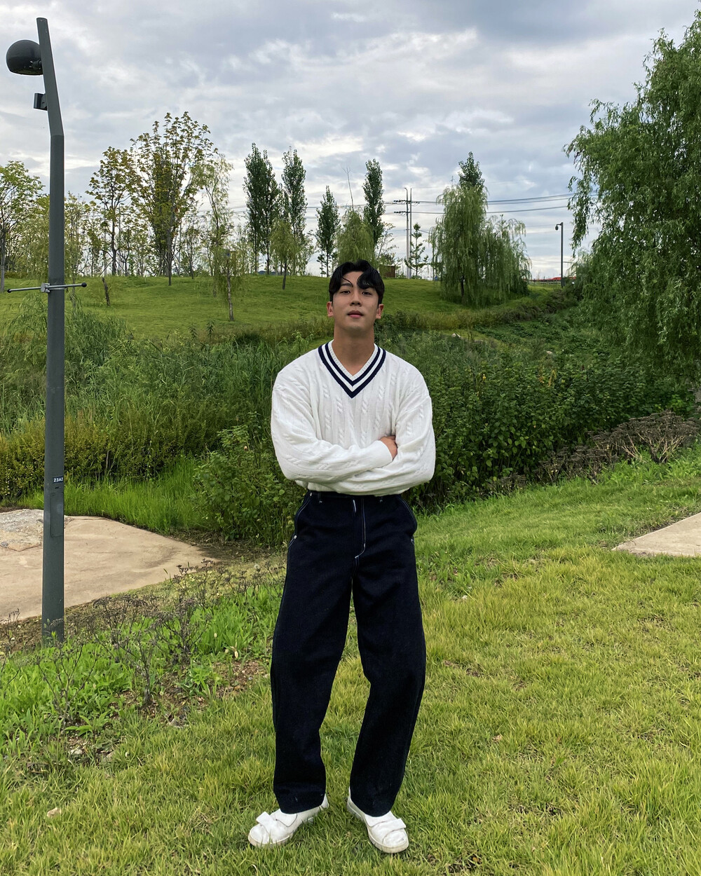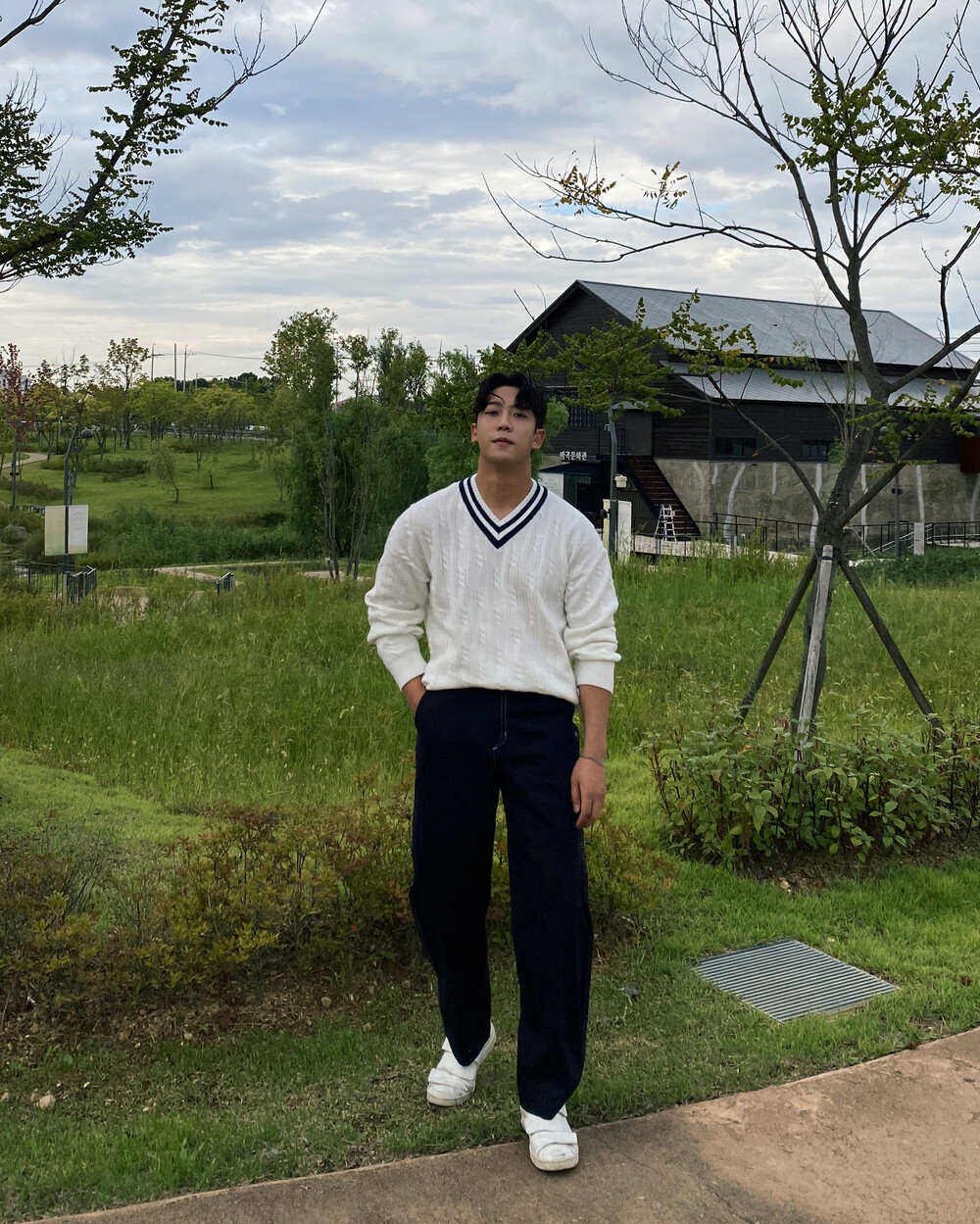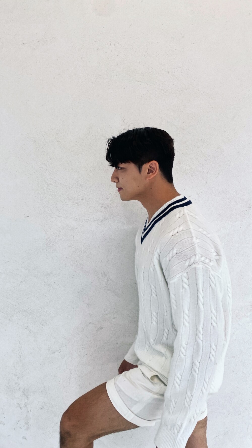 브이넥에 두줄 패턴이 들어가 포인트를 살린 가을 니트 입니다