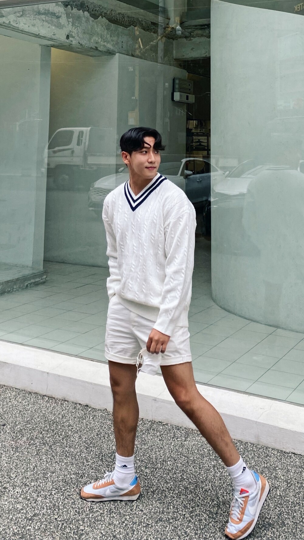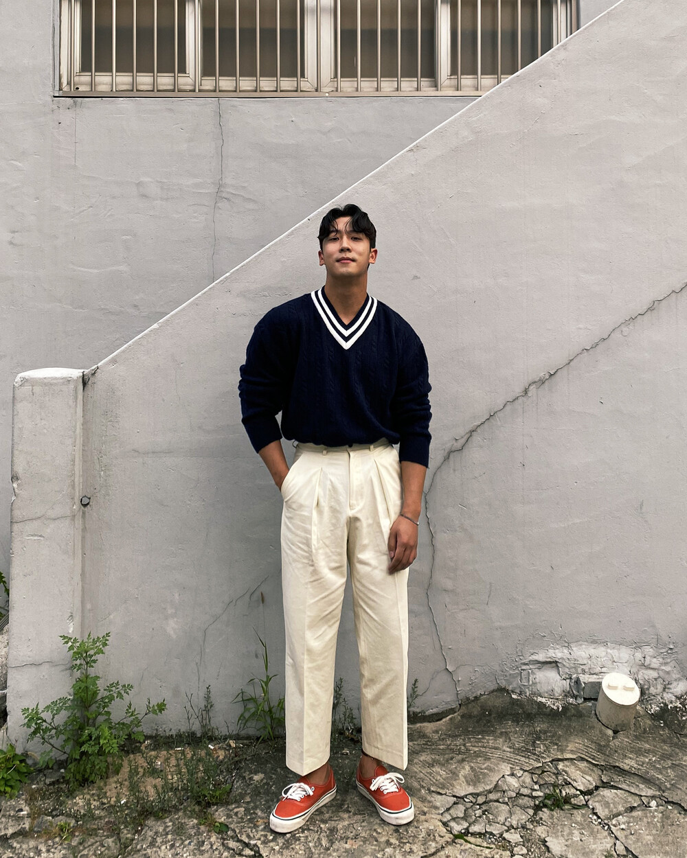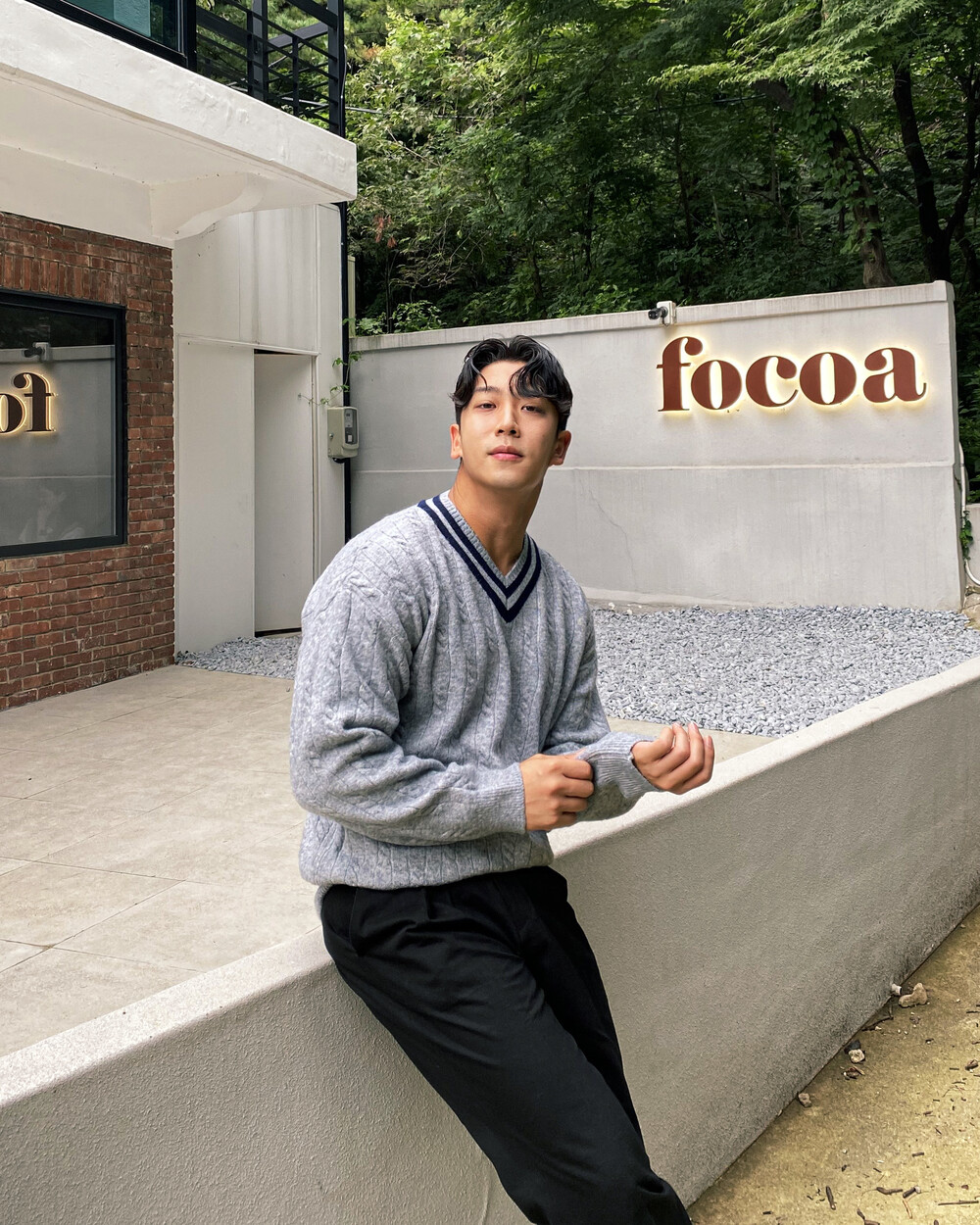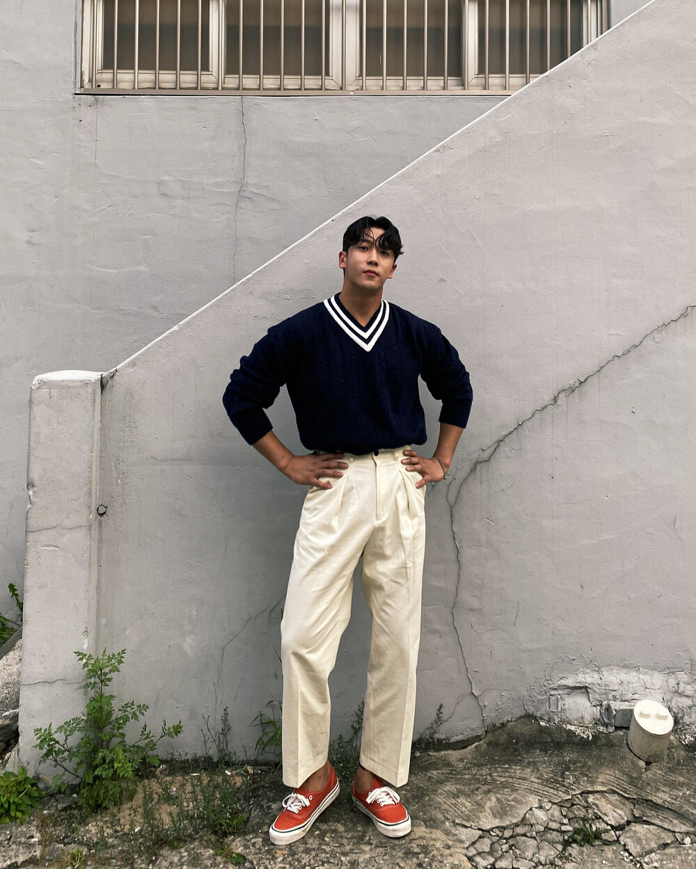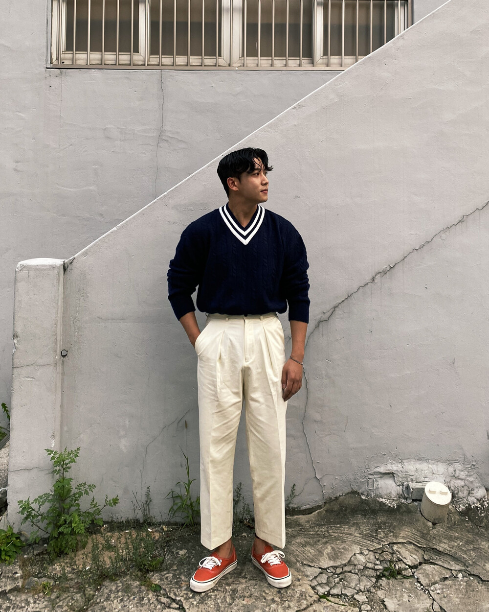 브이넥에 두줄 패턴이 들어가 포인트를 살린 가을 니트 입니다