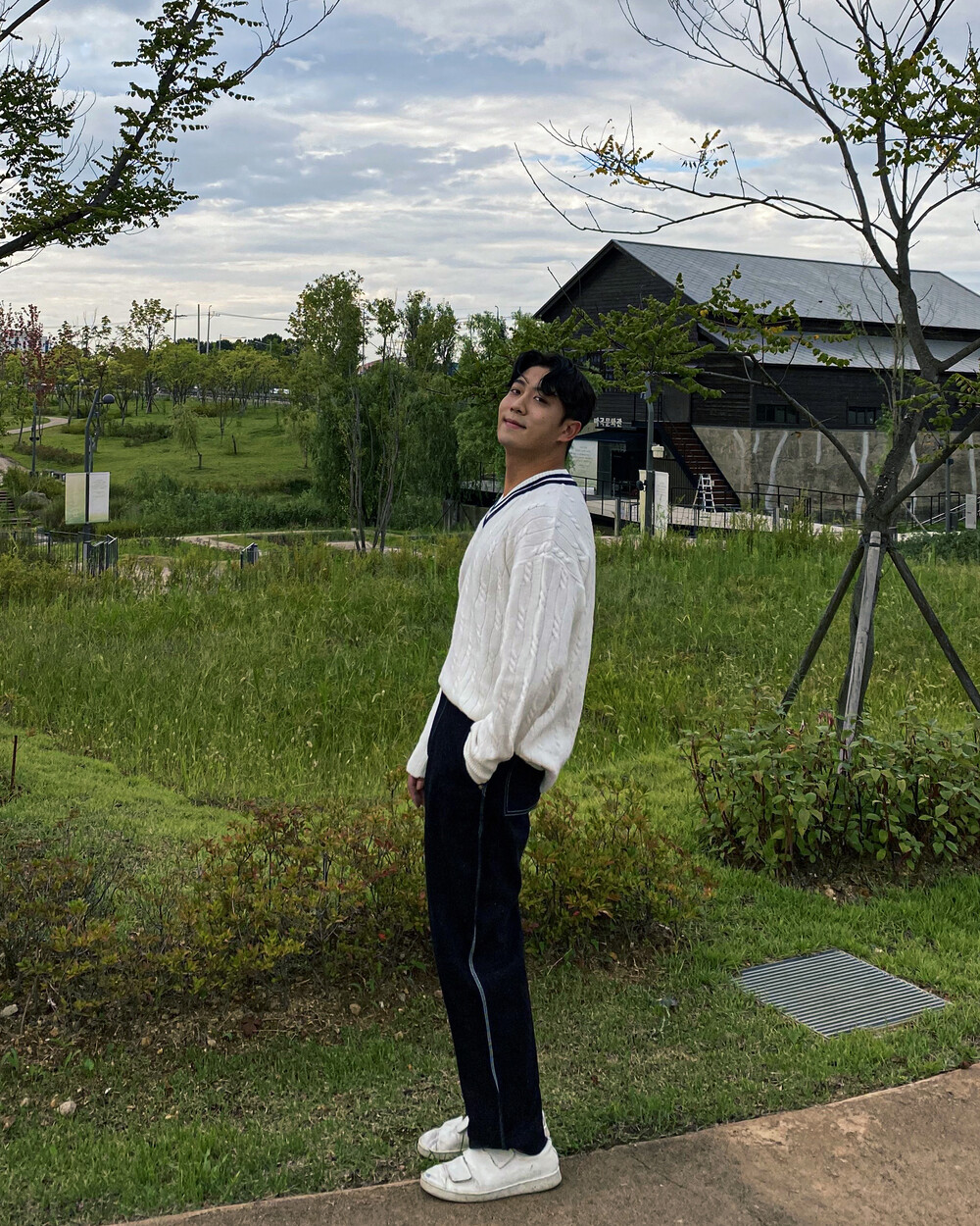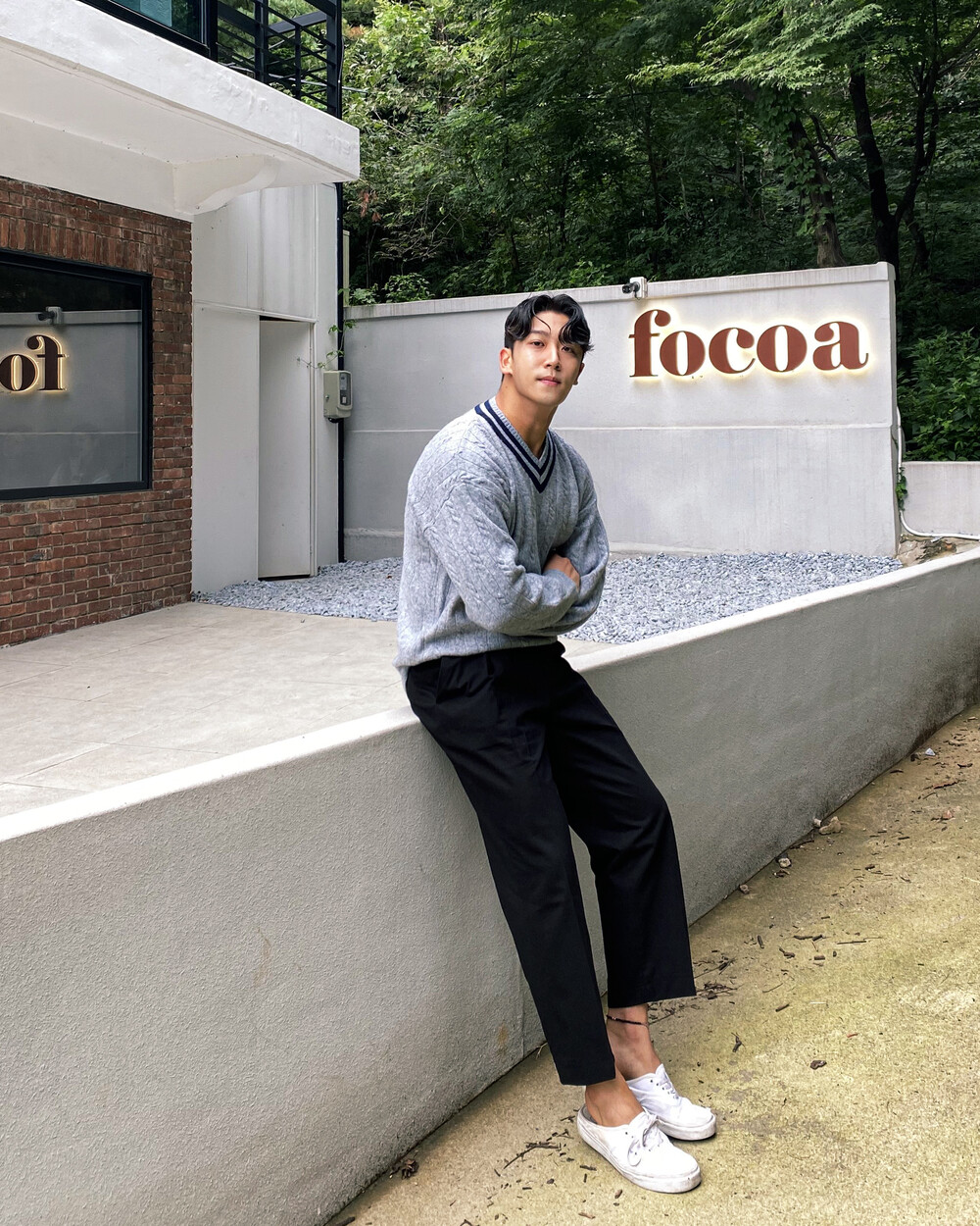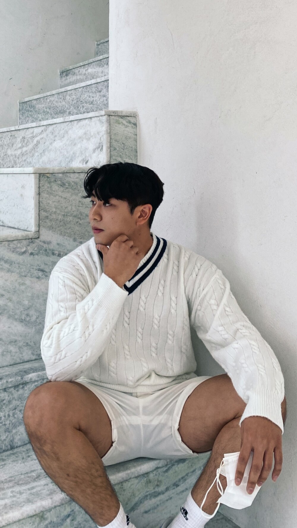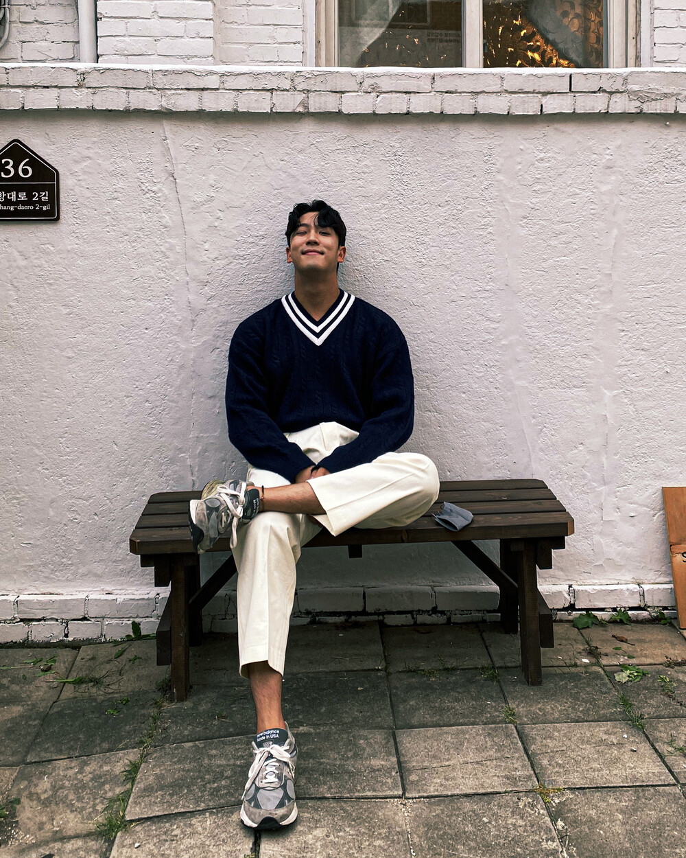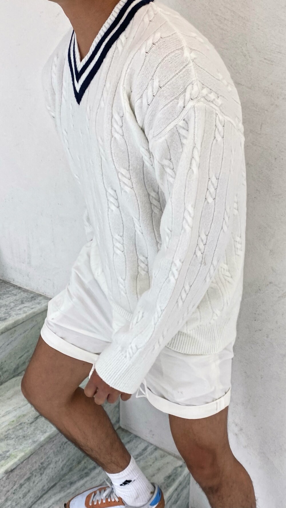 브이넥에 두줄 패턴이 들어가 포인트를 살린 가을 니트 입니다