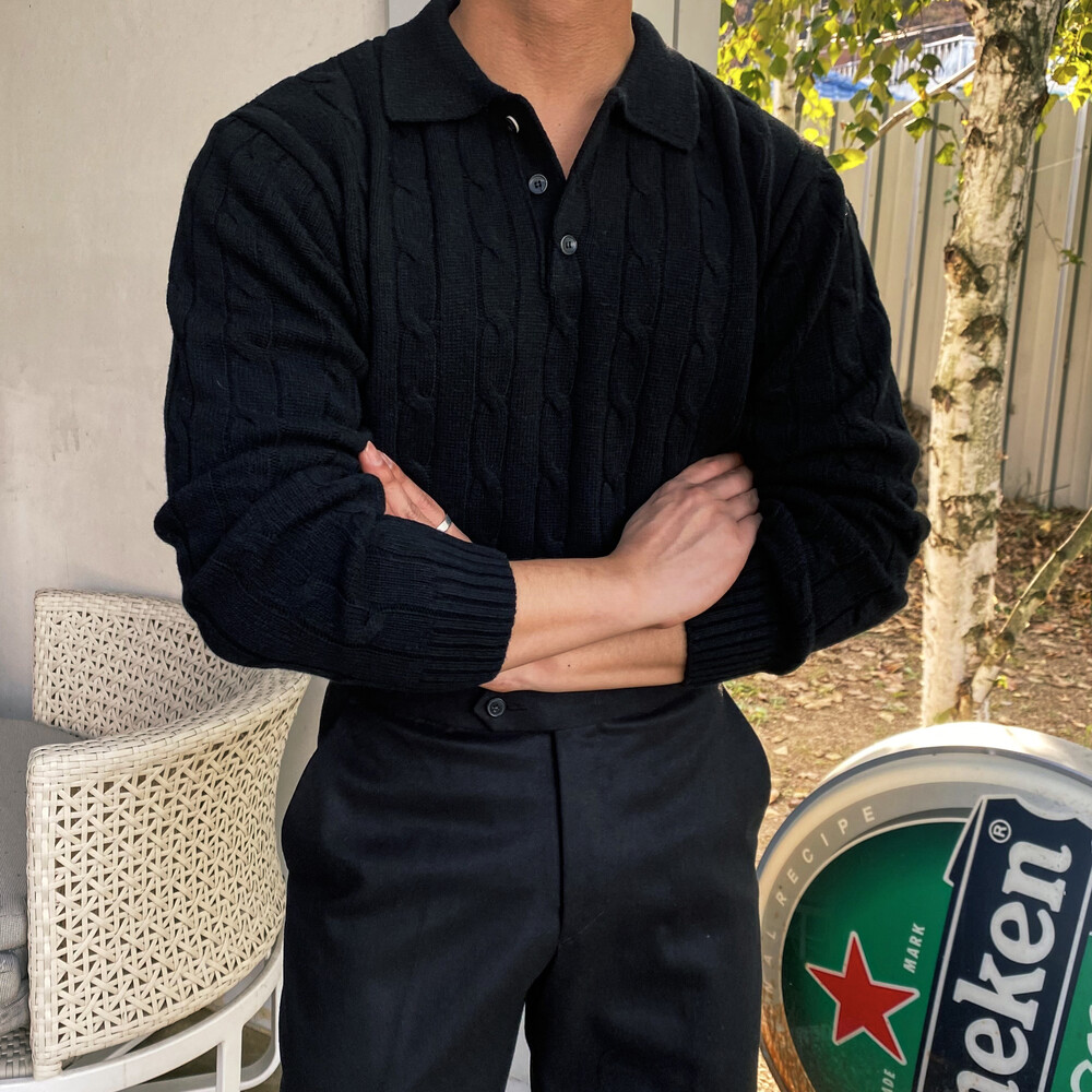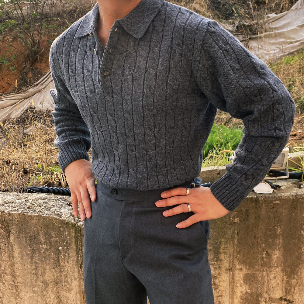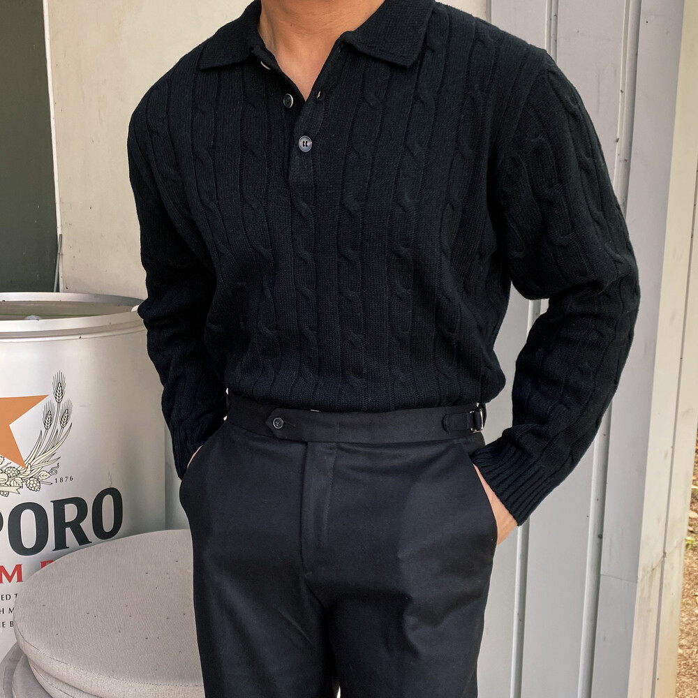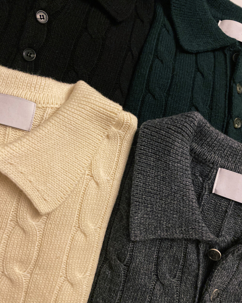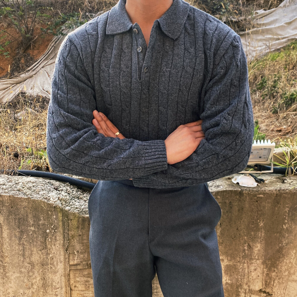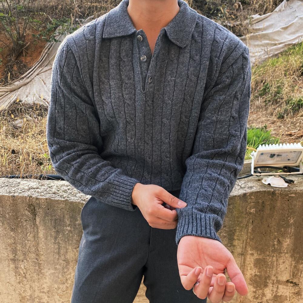 울 원단의 따뜻함 가득한 꽈배기 패턴의 카라니트입니다