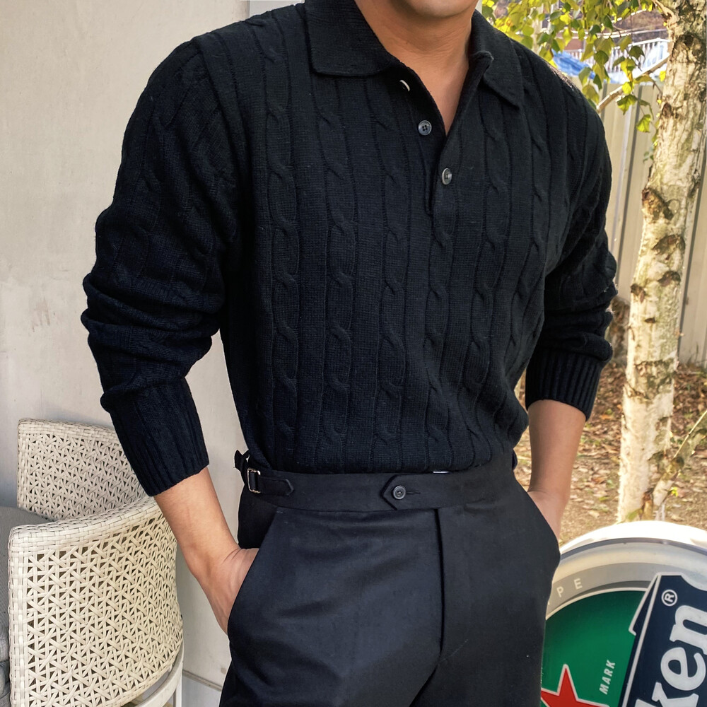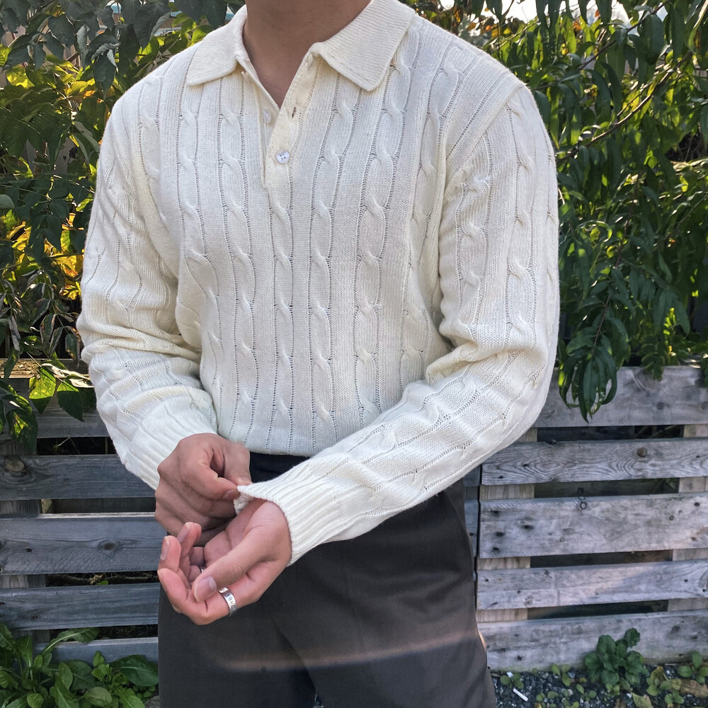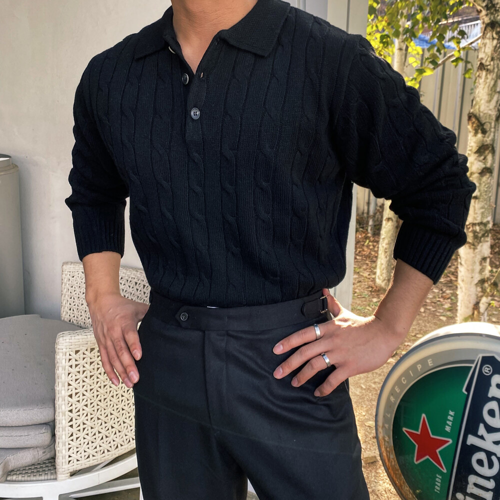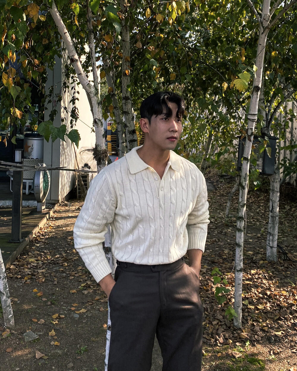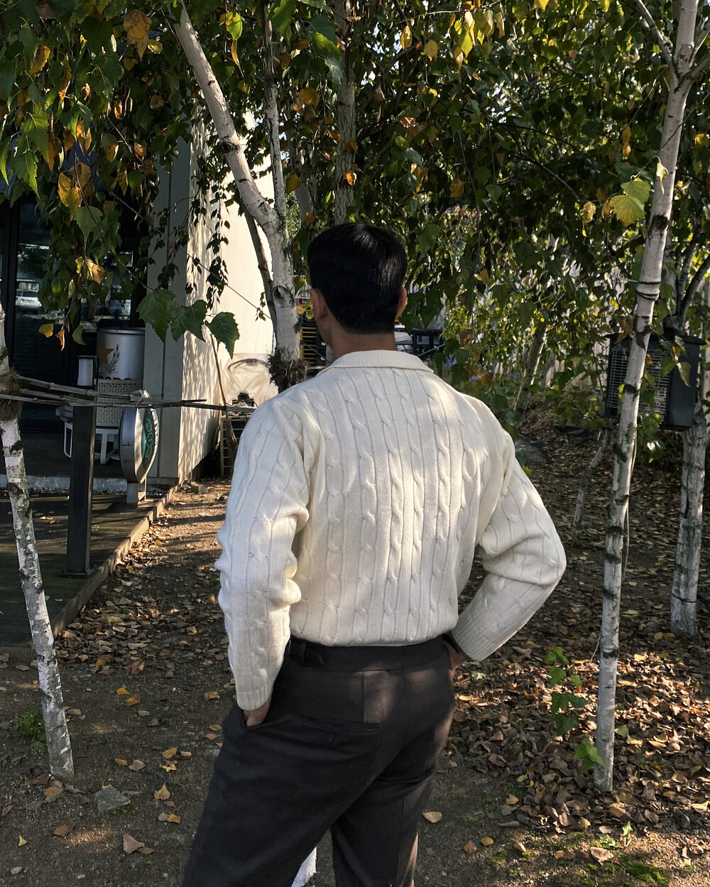 울 원단의 따뜻함 가득한 꽈배기 패턴의 카라니트입니다
