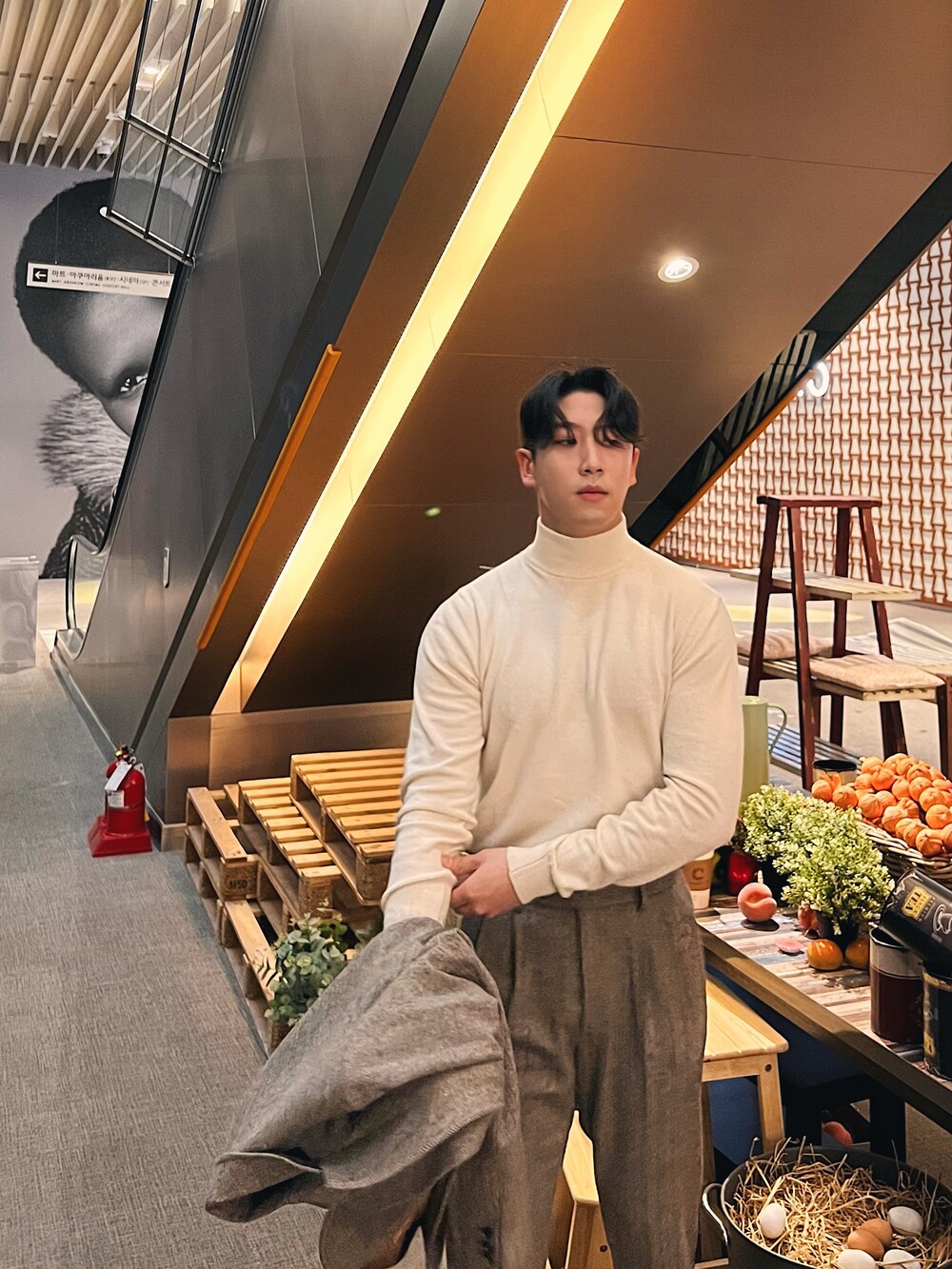 정핏으로 나온 캐시미어 원단의 모크넥 니트입니다