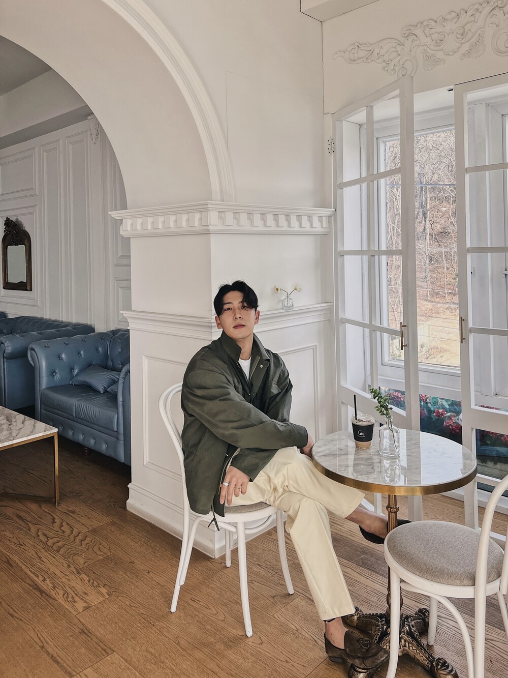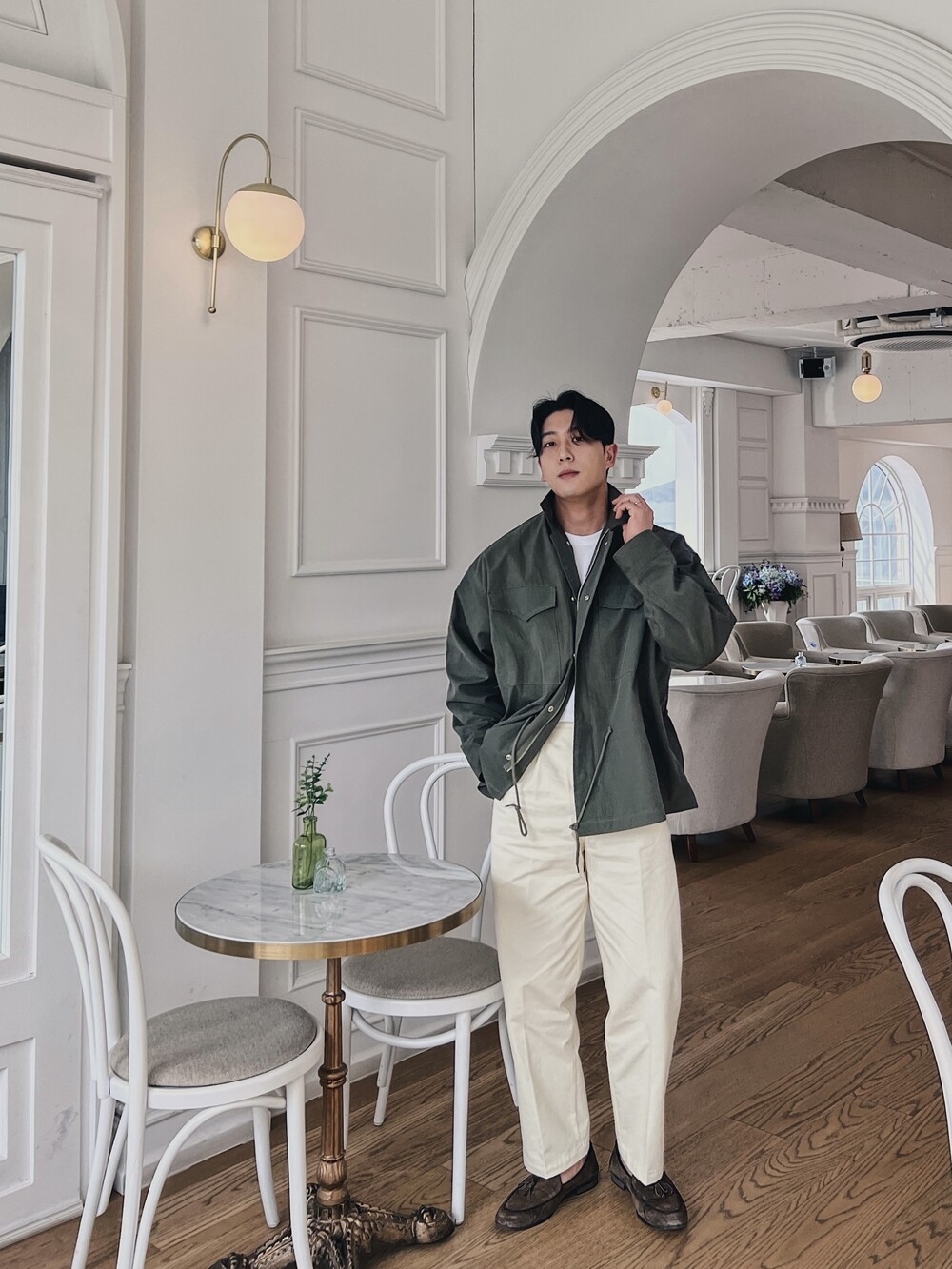 세미 와이드 핏의 면 치노 팬츠입니다