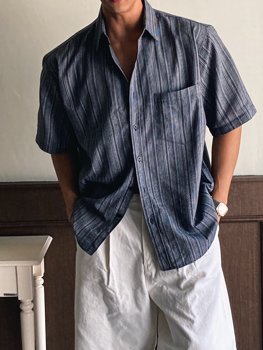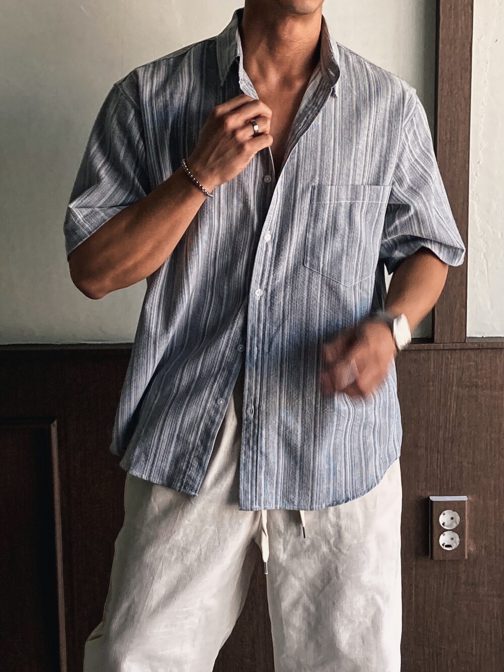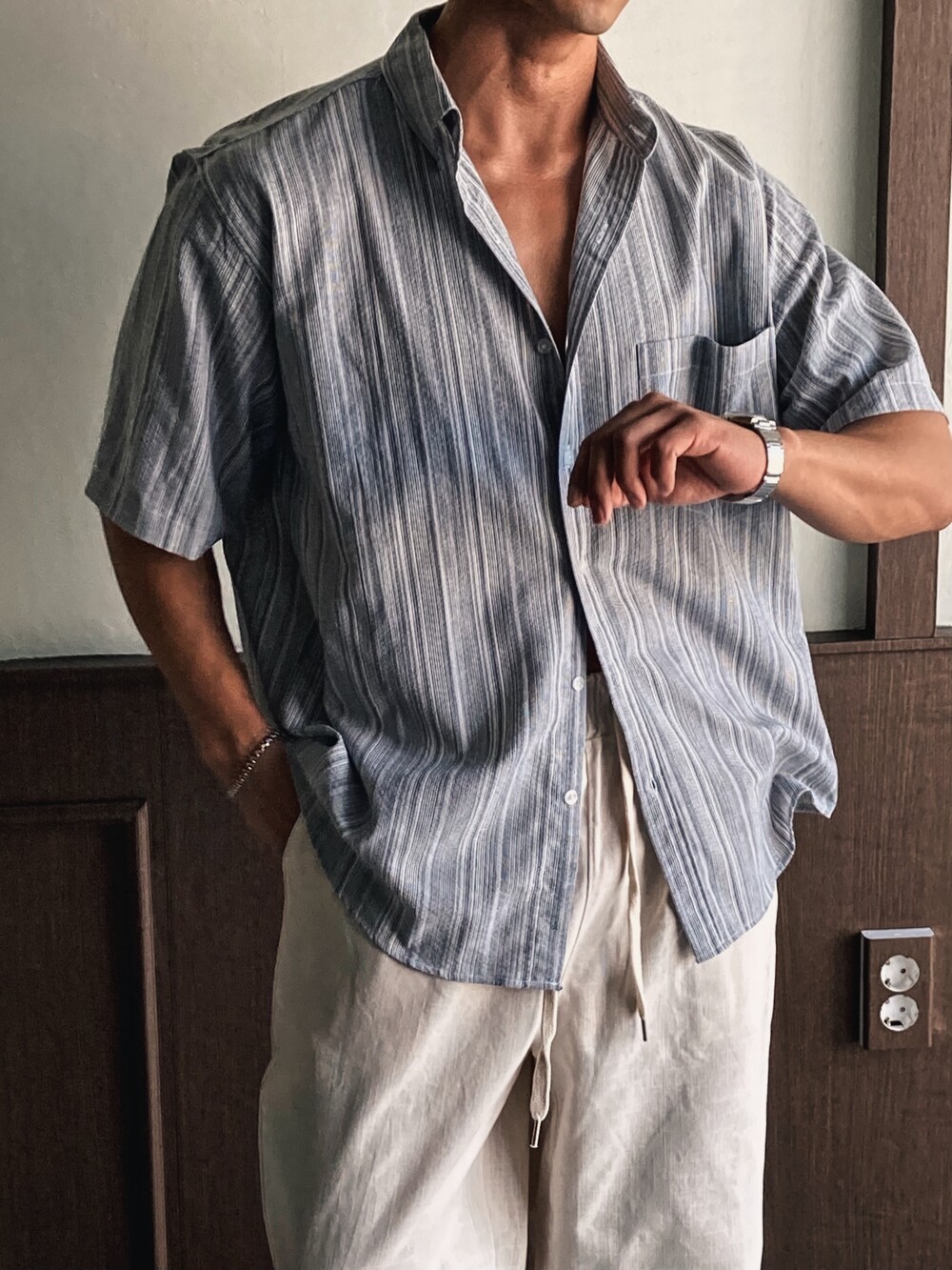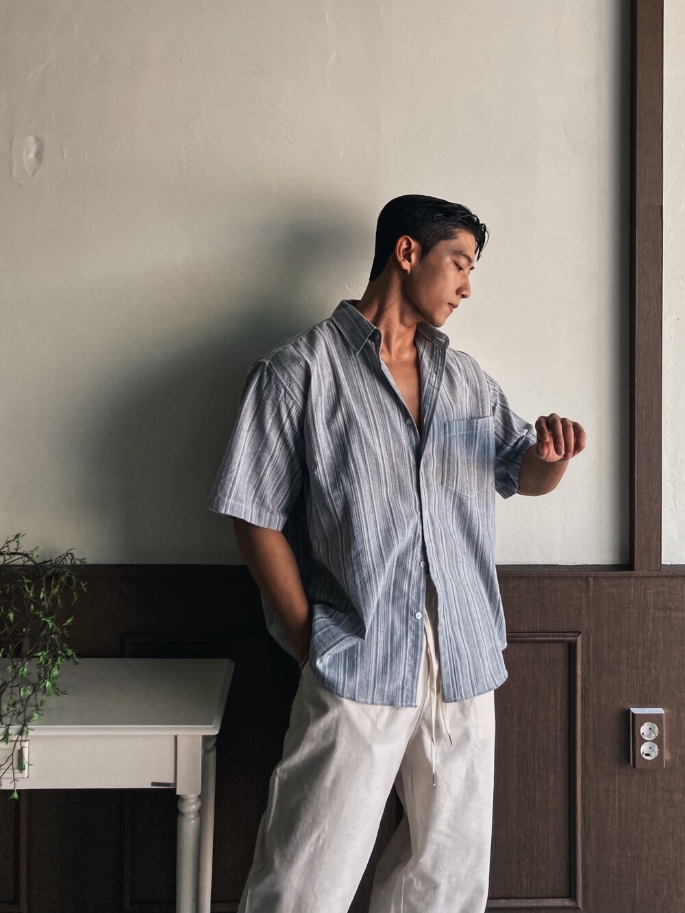 - 얇은 린넨/코튼 원단에 반팔 오버핏 셔츠