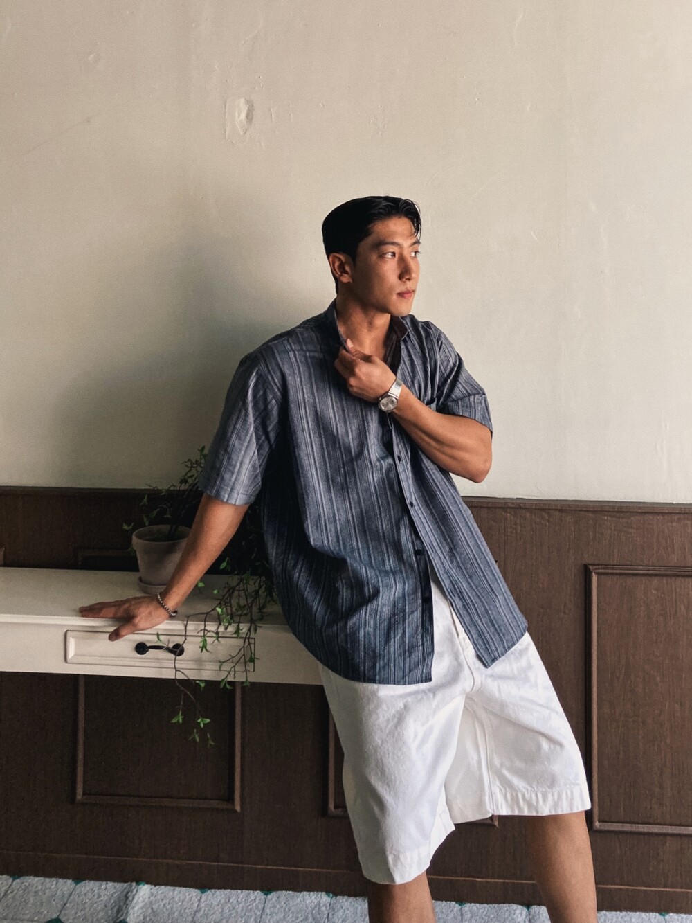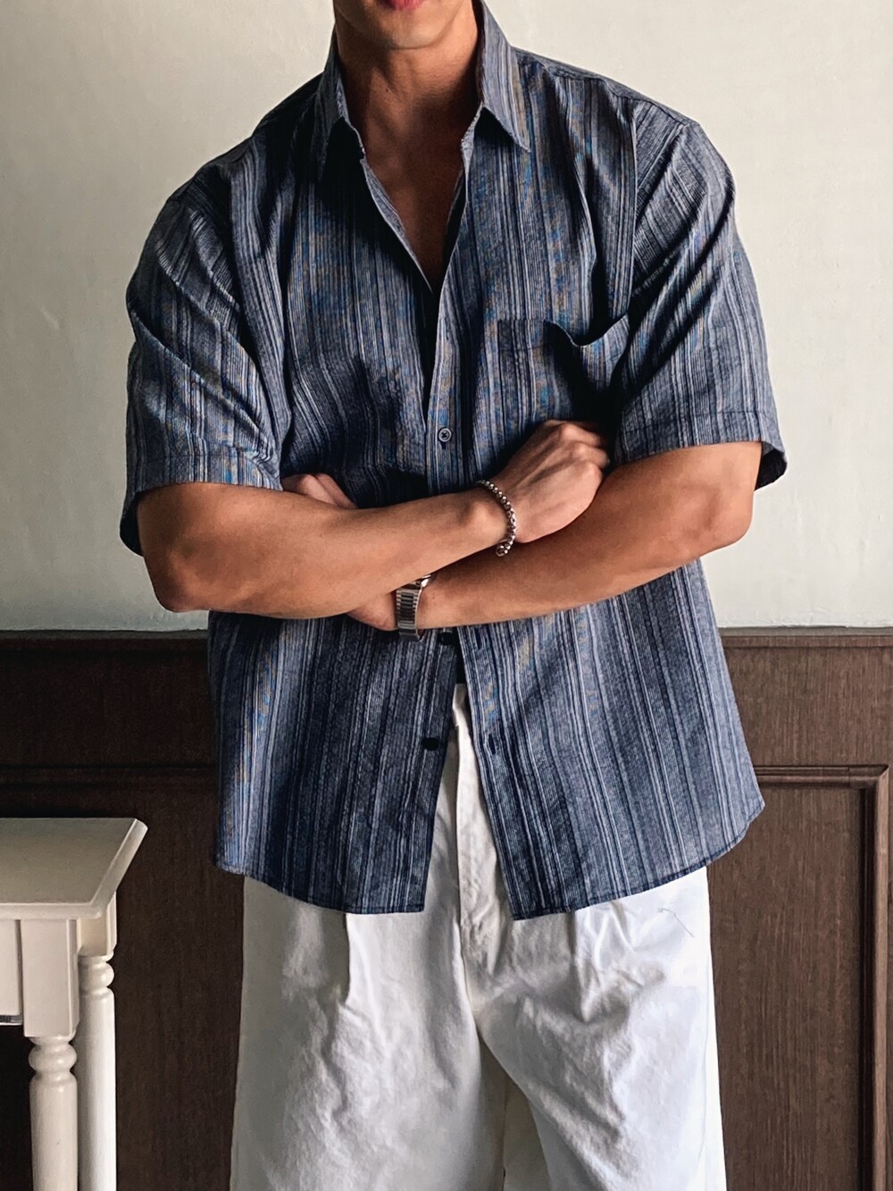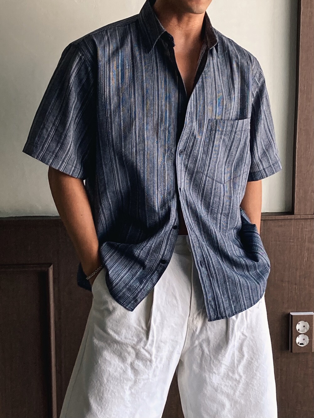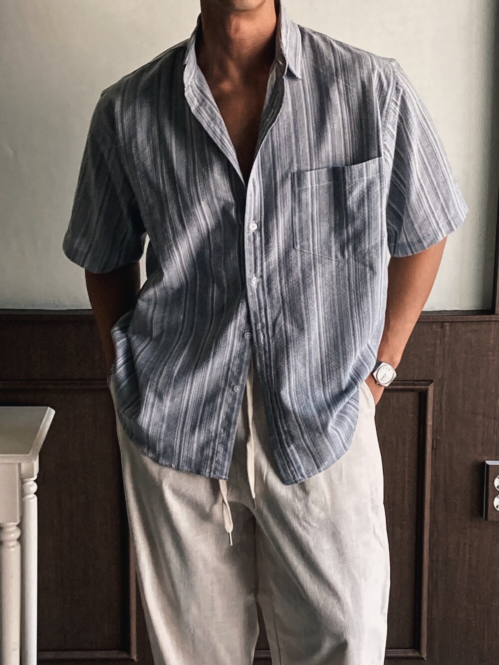 - 얇은 린넨/코튼 원단에 반팔 오버핏 셔츠
