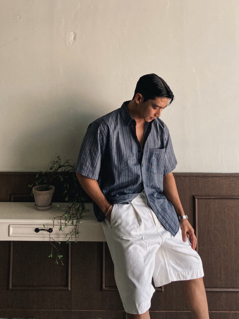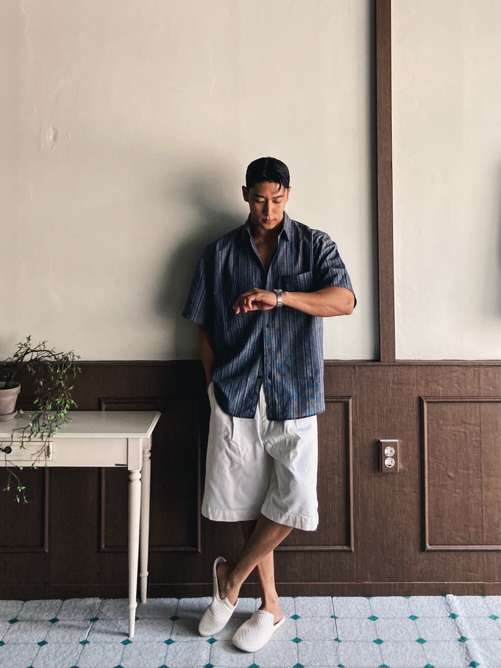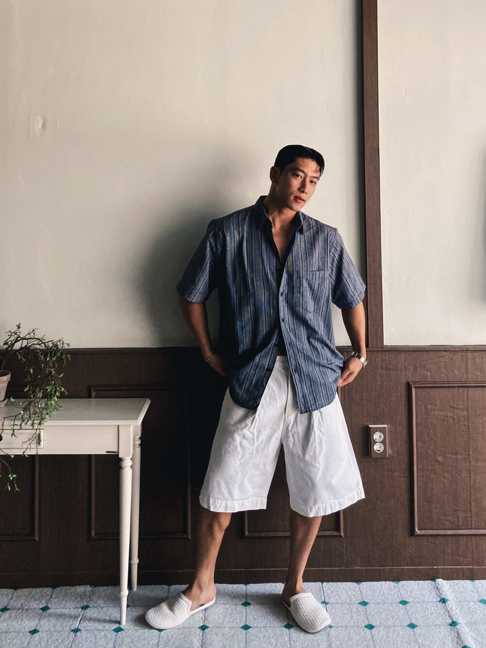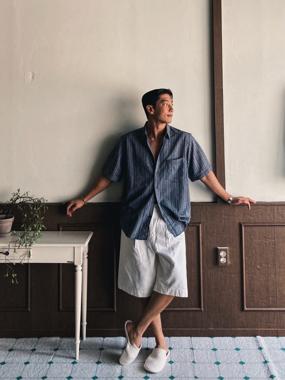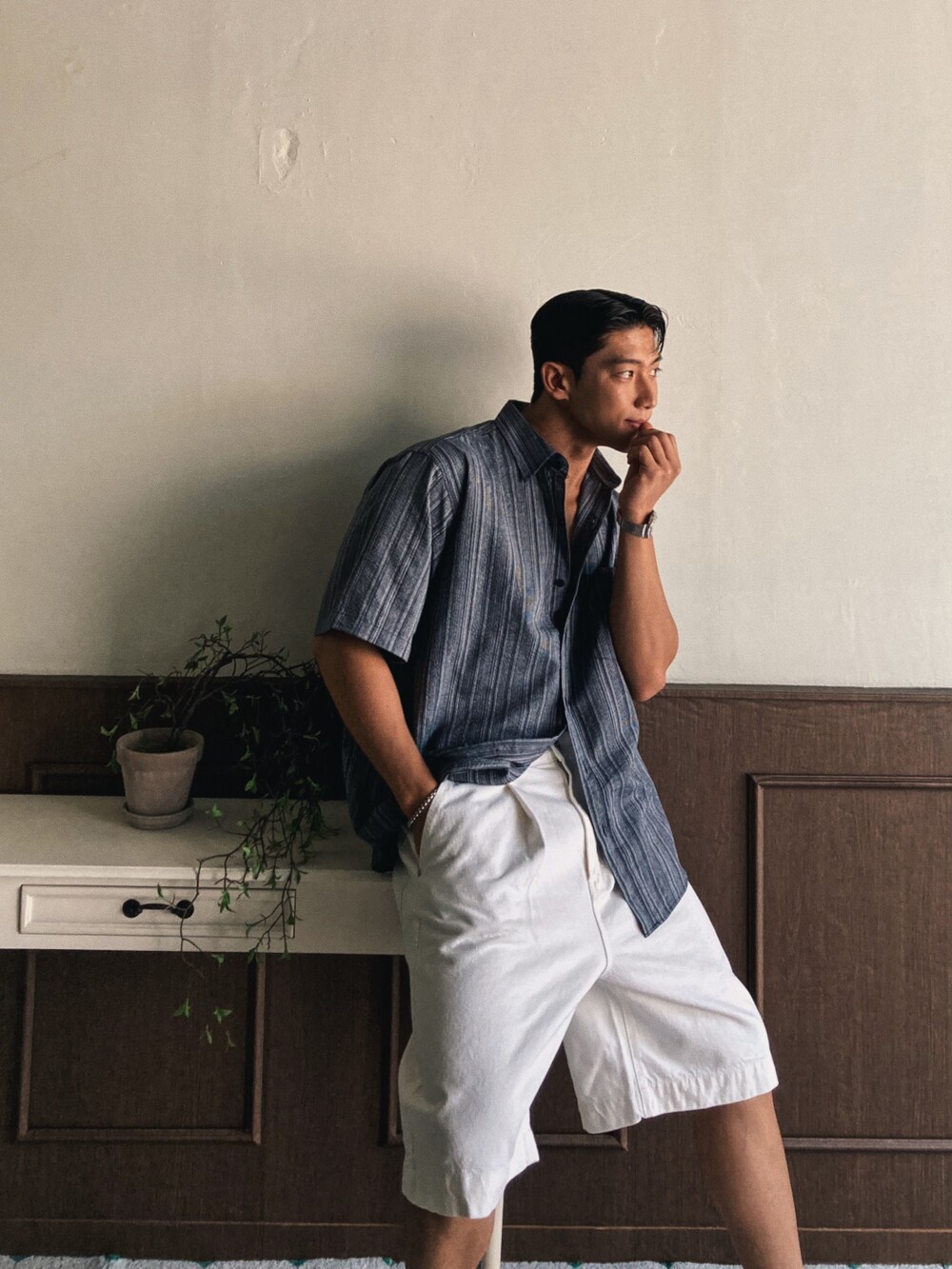 - 얇은 린넨/코튼 원단에 반팔 오버핏 셔츠