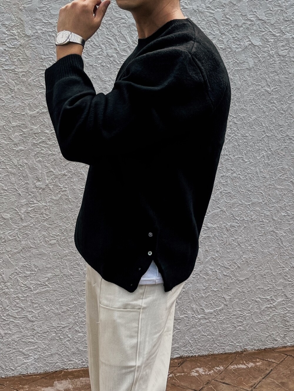 - 밑단 양 옆 절개(버튼)로 떨어지는 핏 조절 가능